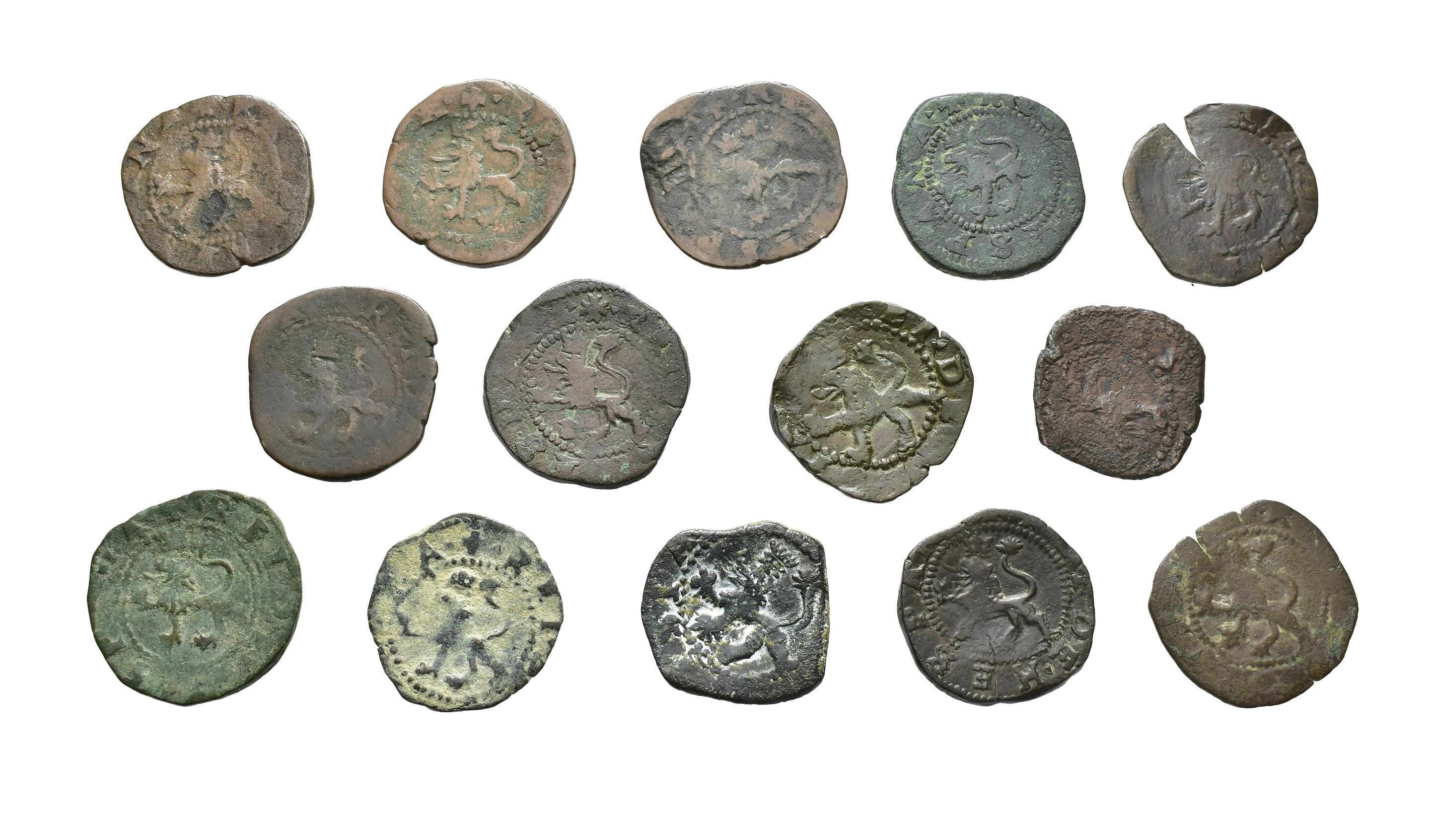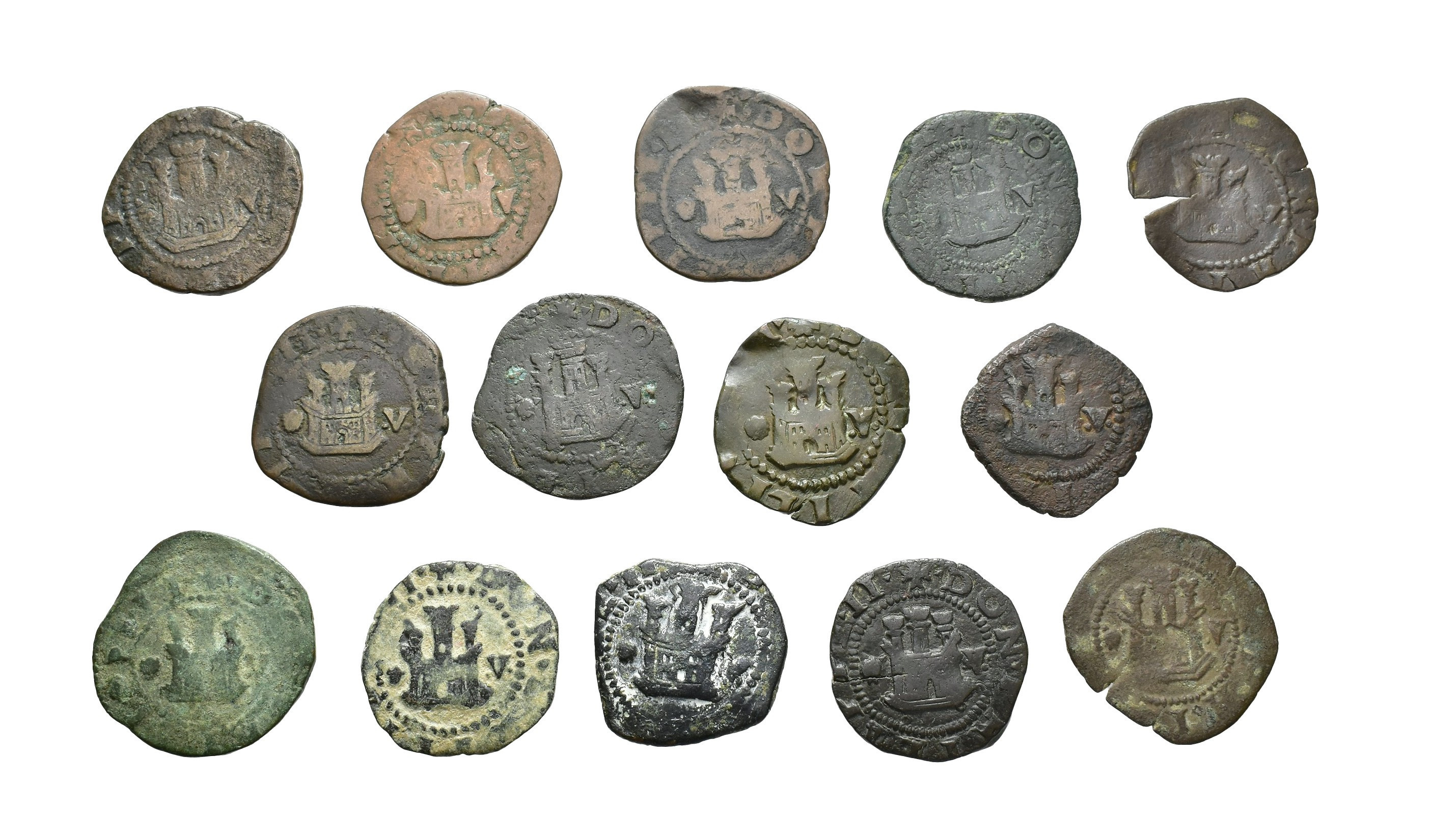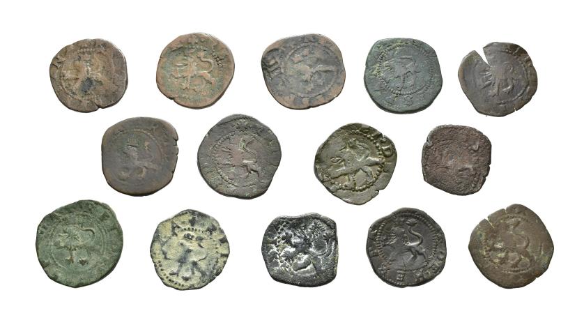 FELIPE II. Lote de 14 monedas de 2 maravedís, Coruña V. Orol-MO. 325,327, 3298, 331, 333, 335, 338, 340, 342, 344, 346, 348, 350 y 352. RC/MBC-