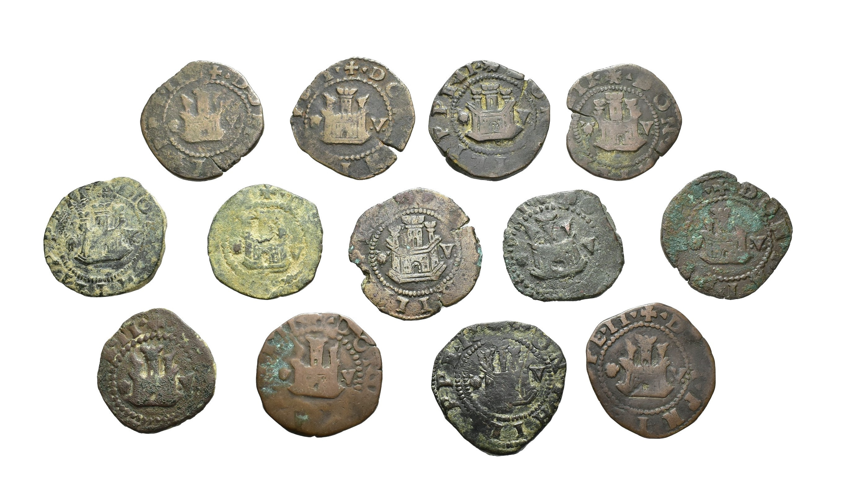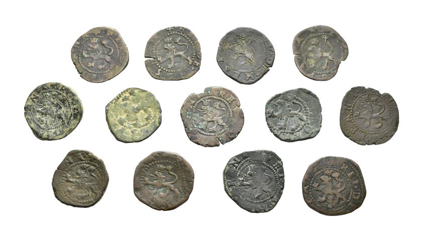 FELIPE II. Lote de 13 monedas de 2 maravedís, Coruña V. Orol-MO. 326, 328, 330, 332, 334, 336, 339, 341, 343, 345, 347, 349 y 351. BC-/MBC.
