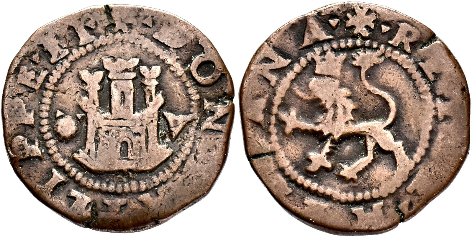 FELIPE II. 2 maravedís. Coruña. Venera sobre V. CU 4,07 g. 22,6 mm. RS-38 var. Orol-MO.323 MBC-/BC+. Escasa.
