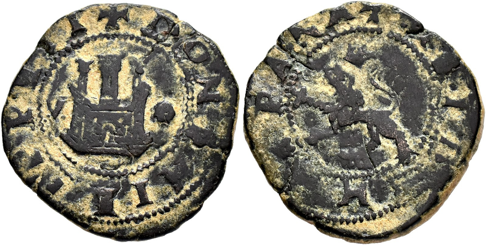 FELIPE II. 2 maravedís. Coruña. V entre puntos a la izq. del castillo. CU 5,21 g. 24,7 mm. RS-41; JS-A.62. Orol-MO.356 MBC-/BC+. Muy escasa.