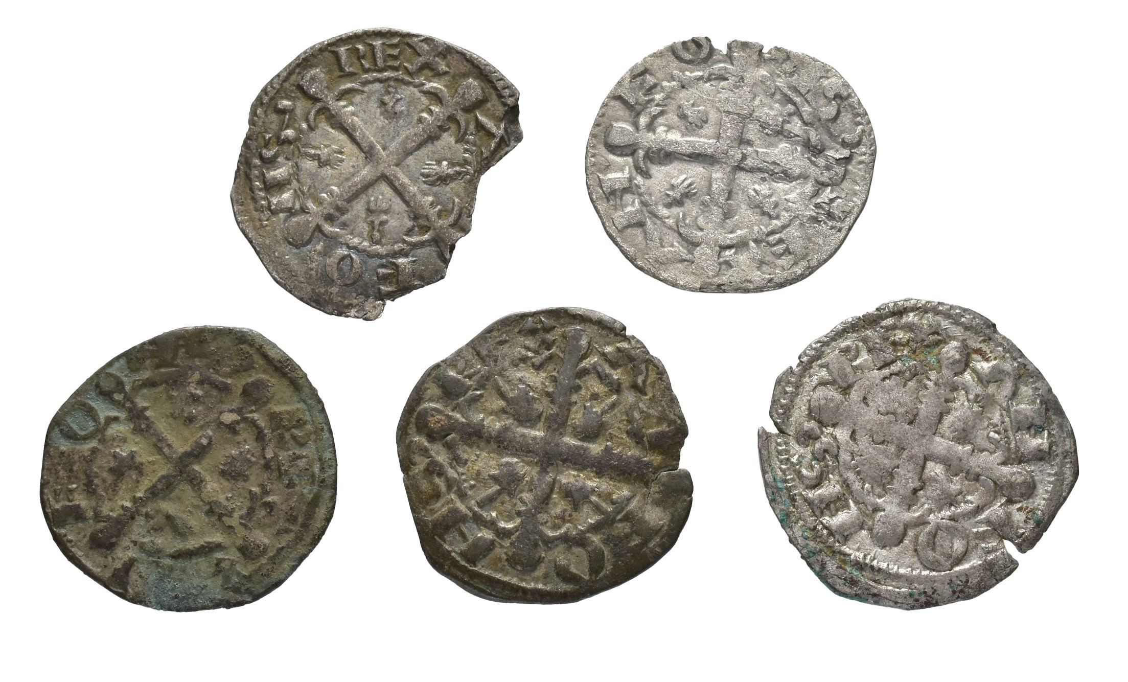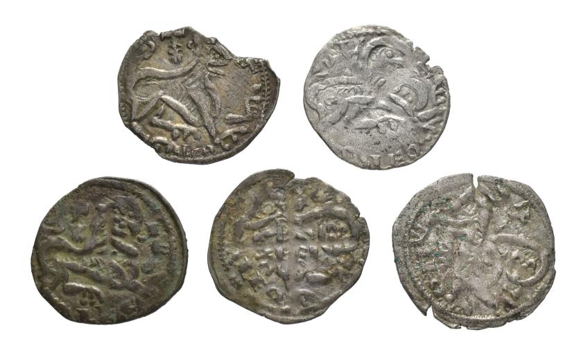REINOS DE CASTILLA Y LEÓN. ALFONSO IX. Lote de 5 dineros, Santiago. Orol-ME.64, 65, 66, 67 y 68. Uno con roturas al borde. BC+/MBC-.