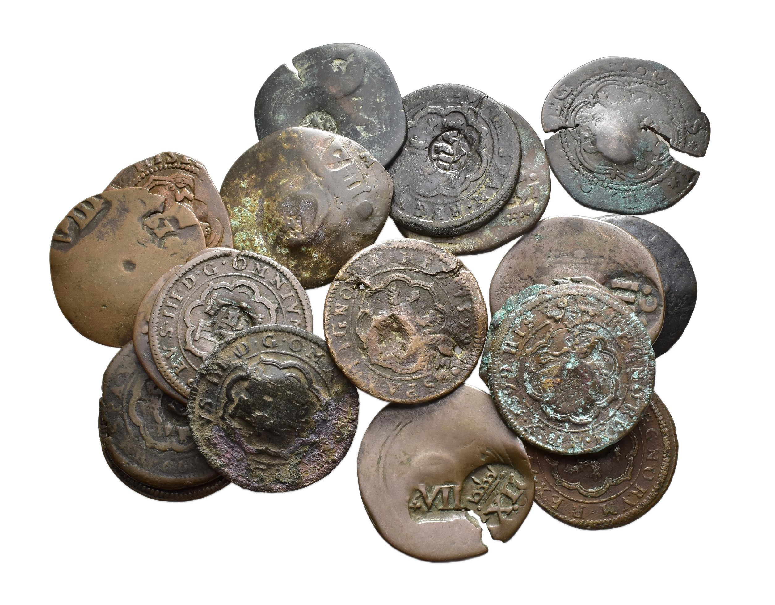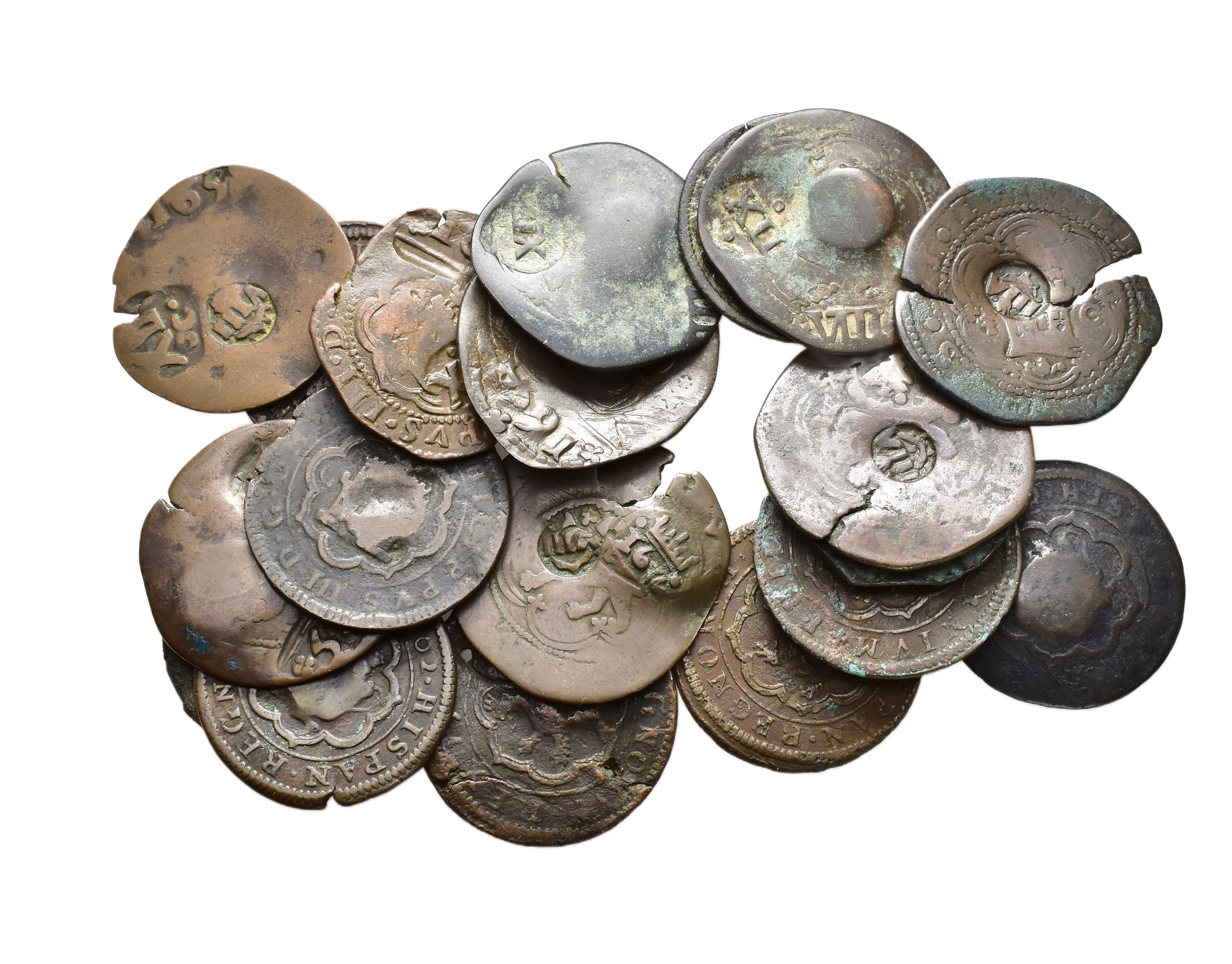 FELIPE III. Lote de 19 cobres de Reyes Católicos a Felipe III (9 del Ingenio) con resello VIII maravedís Coruña (1603). Algunos con resellos múltiples anteriores. Orol-MO.393. Los resellos BC/MBC.
