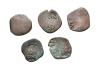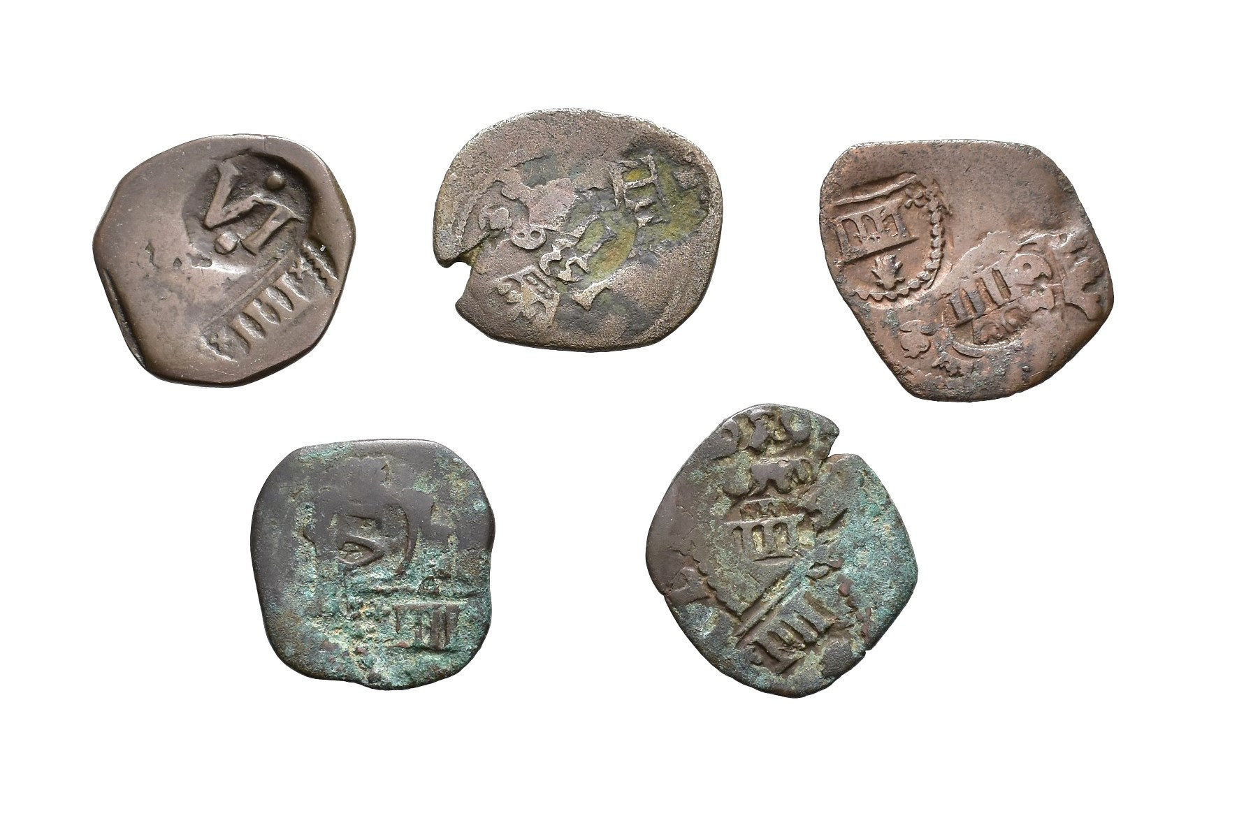 FELIPE IV. Lote de 5 cobres a martillo con resello IIII maravedís 1654 Coruña con varios resellos. Los resellos BC+/MBC. Muy escasos.