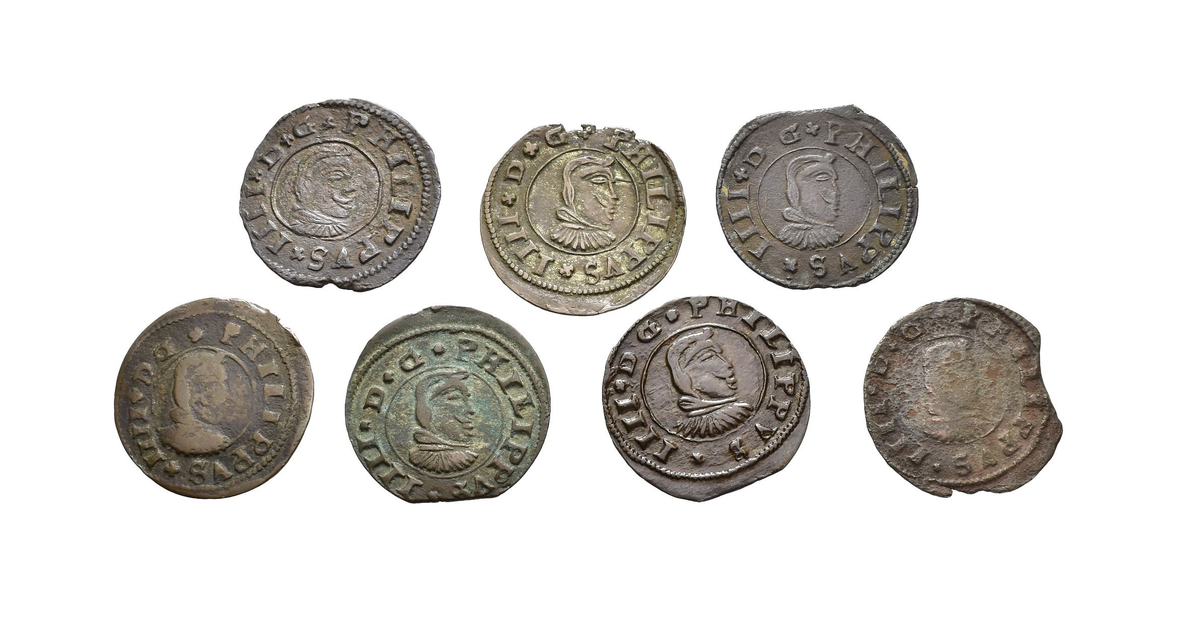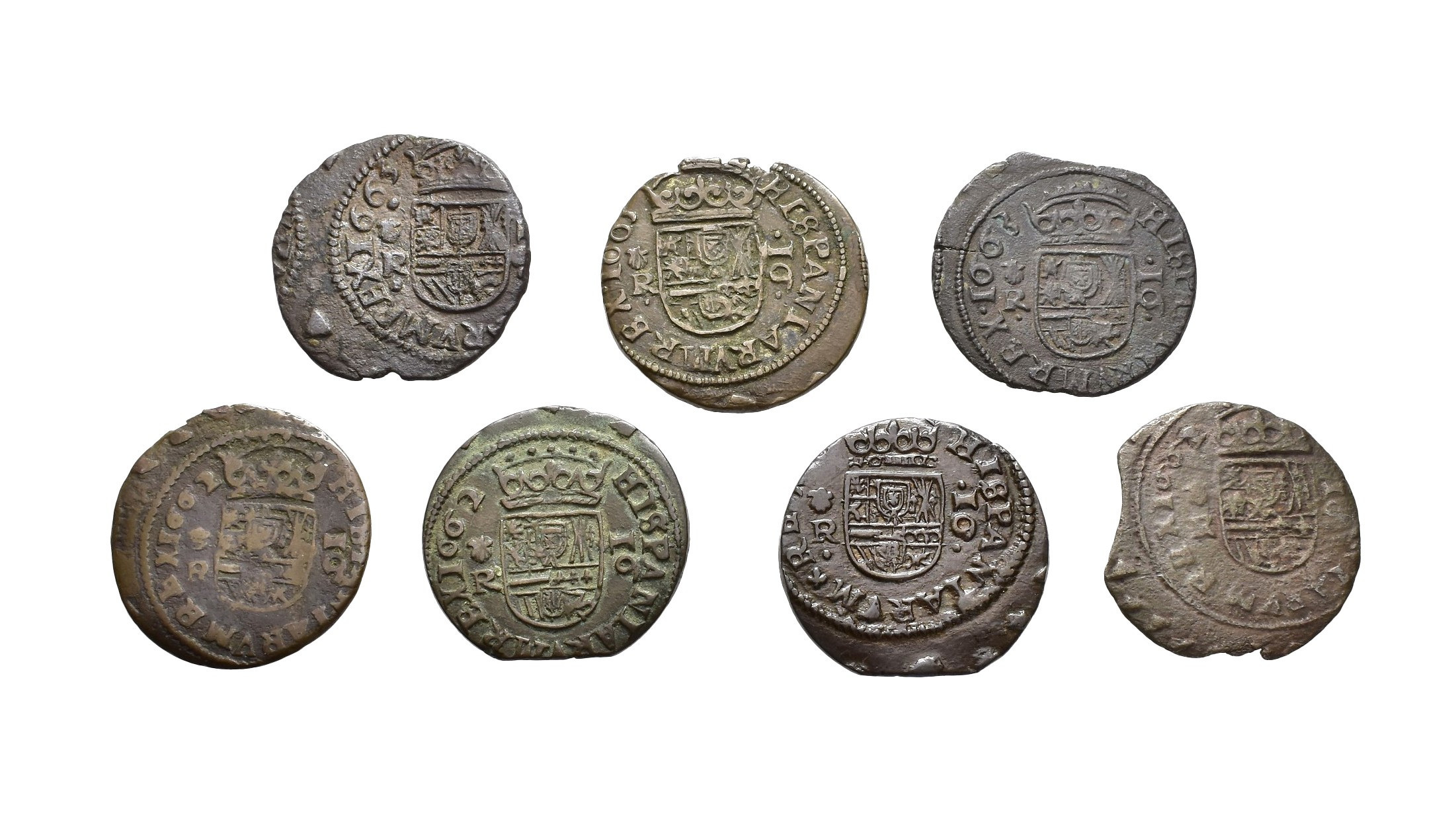 FELIPE IV. Lote de 7 piezas de 16 maravedís, Coruña: 1662 (2), 1663 (3) y sin fecha visible (1). BC+/MBC+.