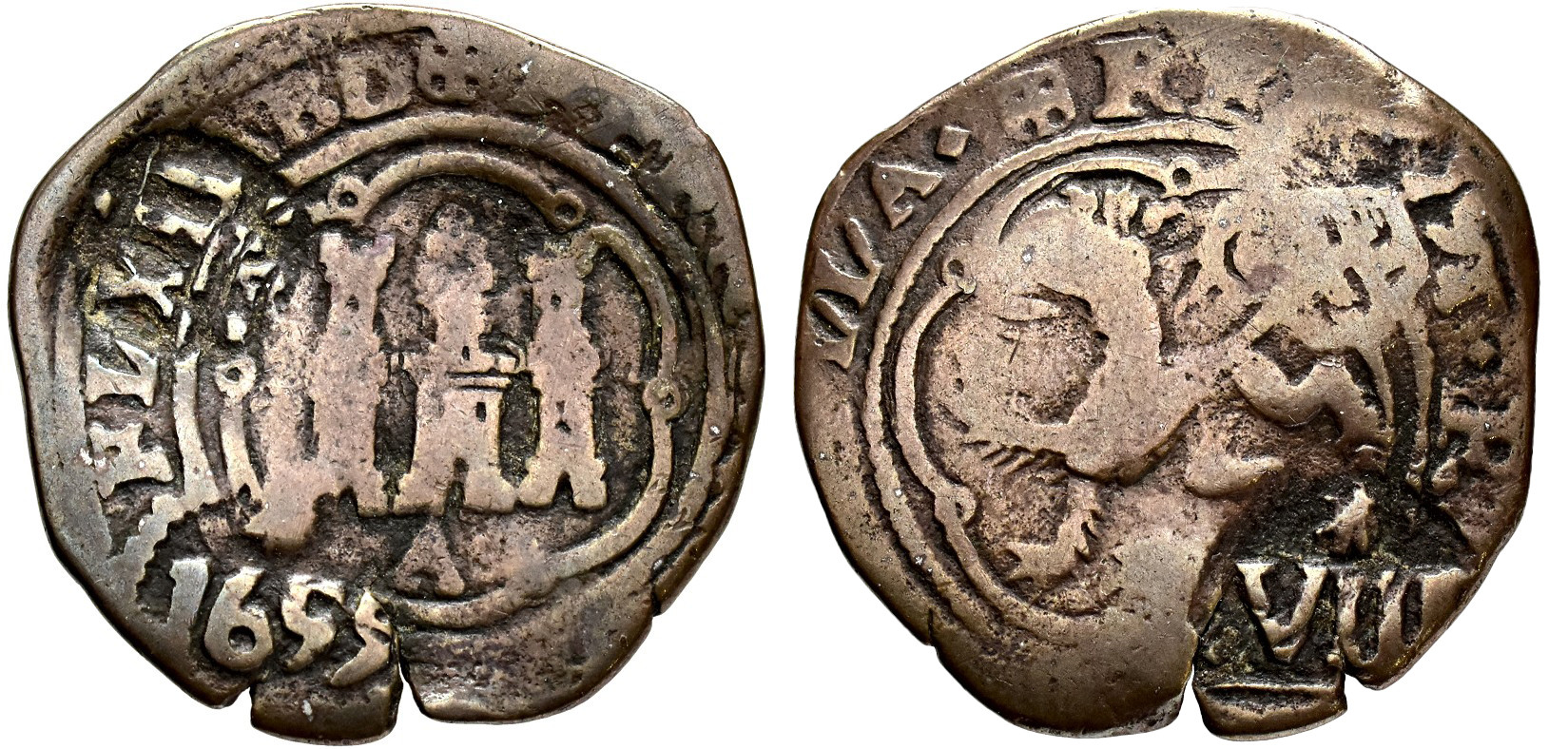 FELIPE IV. Sobre 4 maravedís de Reyes Católicos Coruña A doble resello de XII maravedís 1636 de ceca dudosa y VIII maravedís 1655, Coruña. RS-147; Orol-MO.409. Resellos MBC. Rara.