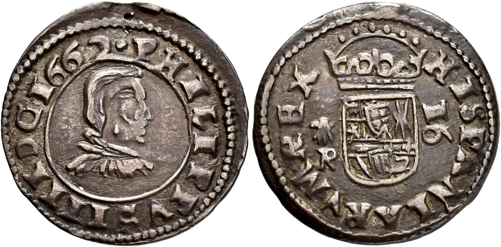FELIPE IV. 16 maravedís. 1662. Coruña. R. Fecha en anv. CU 4,59 g. 25,9 mm. RS-128; Orol-MO.433 MBC.