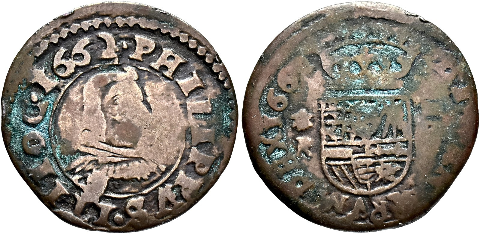 FELIPE IV. 16 maravedís. 1662. Coruña. R. Fecha en anv. y rev. CU 3,23 g. 25,3 mm. RS-136; JS-M.118; Orol-MO.447. BC. Muy rara.