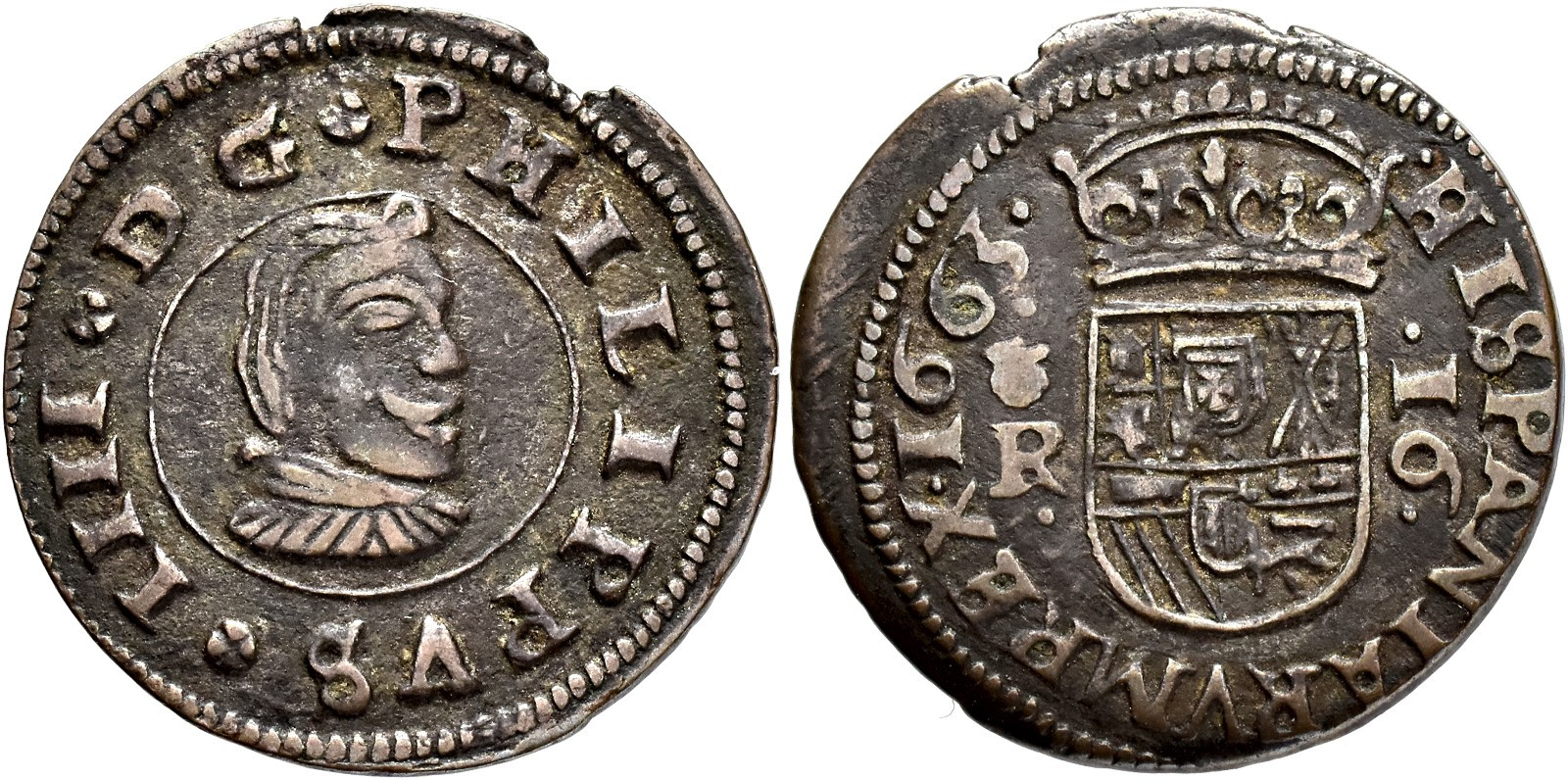 FELIPE IV. 16 maravedís. 1663. Coruña. R. CU 4,15 g. 25,3 mm. RS-134; Orol-MO.467. Roturas al borde. MBC.