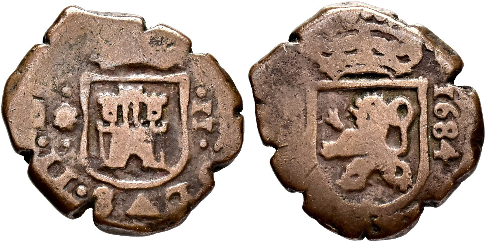 CARLOS II. 2 maravedís. 1684. Coruña. CU 4,9 g. 20,6 mm. RS-8; AC-54; Orol-MO.657 BC+.