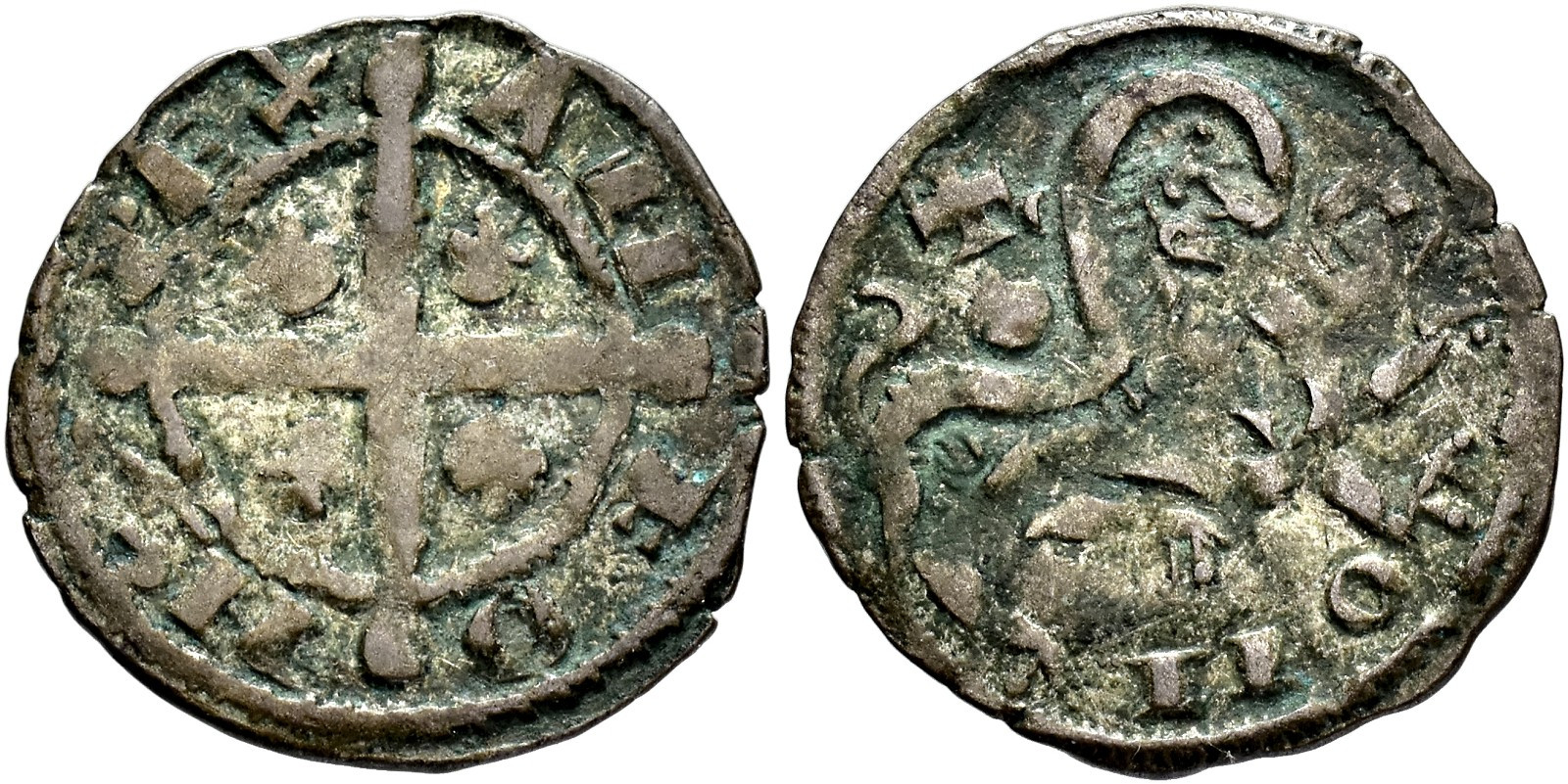 REINOS DE CASTILLA Y LEÓN. ALFONSO IX. Dinero. Coruña. Marca C hacia abajo sobre la pata del león. VE 1,02 g. 17,9 mm. III-123 var.; BMM-224 var.; Orol-ME.15. MBC/MBC-.