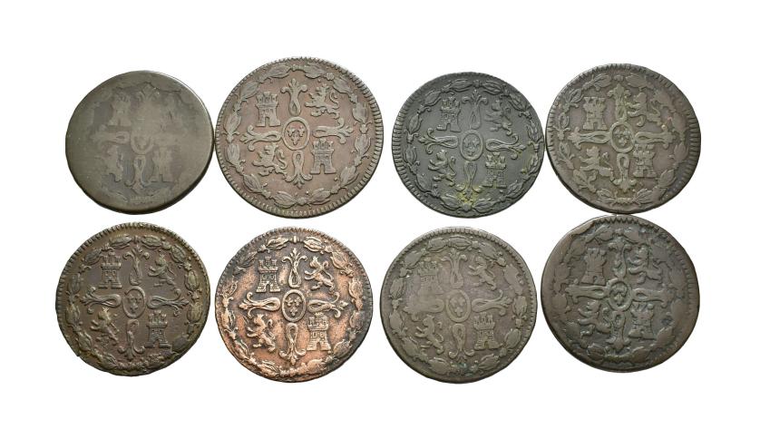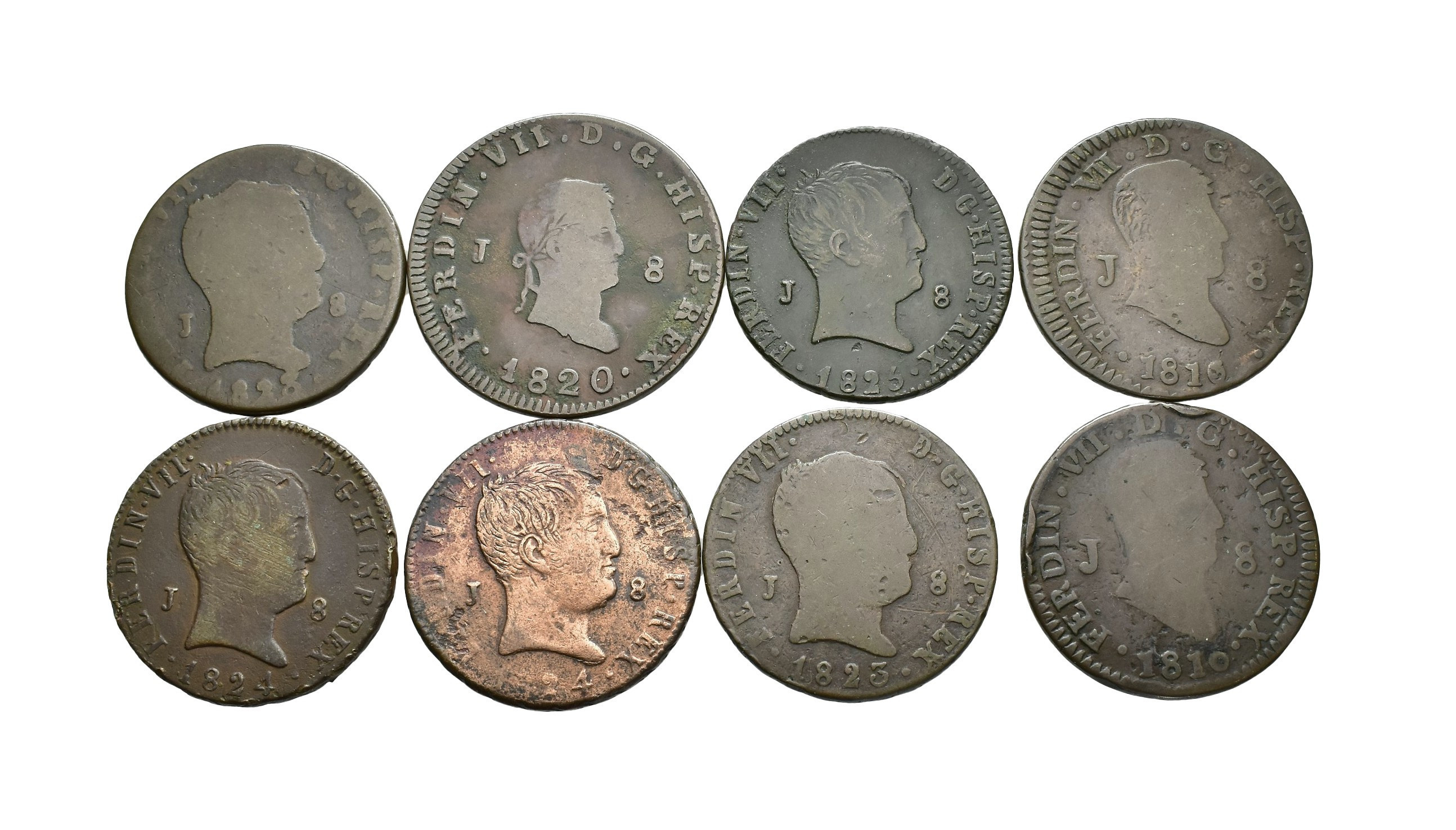 FERNANDO VII. Lote de 8 piezas: 1816 (2), 1820, 1823 (2), 1824 (2, uno de ellas falsa de época) y 1825. Orol-JU-116a y b, 117, 118 a y b, 119, 120 y 121. BC-/MBC.