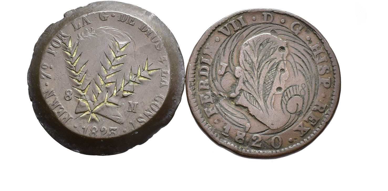FERNANDO VII. Lote de 2 piezas con anversos burilados con motivos vegetales sobre 8 maravedís Jubia. Orol-CO.1 y 21. MBC.