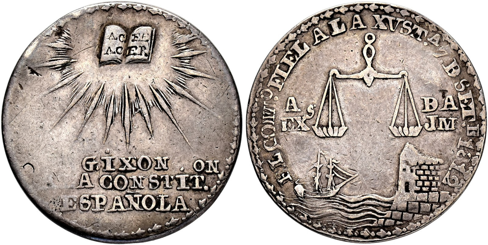 FERNANDO VII. Medalla Gijón a la Constitución, 1812. AR 5,5 g. 25 mm. Orol-JU-109. MBC/MBC-.