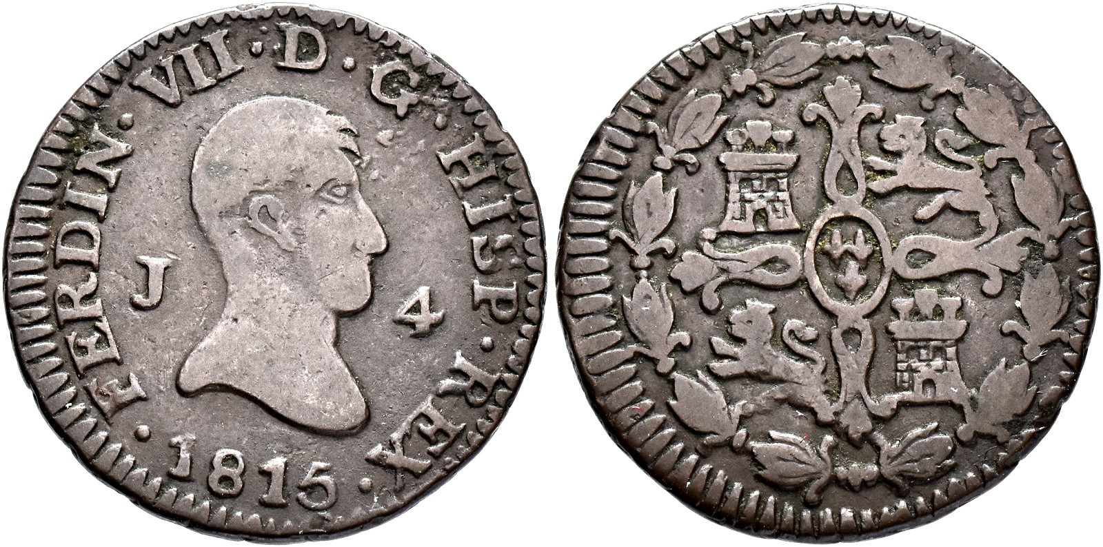 FERNANDO VII. 4 maravedís. 1815. Jubia. CU 5,18 g. 24,9 mm. VI-167; AC-161; Orol-JU.24A BC+/MBC-. Muy escasa.