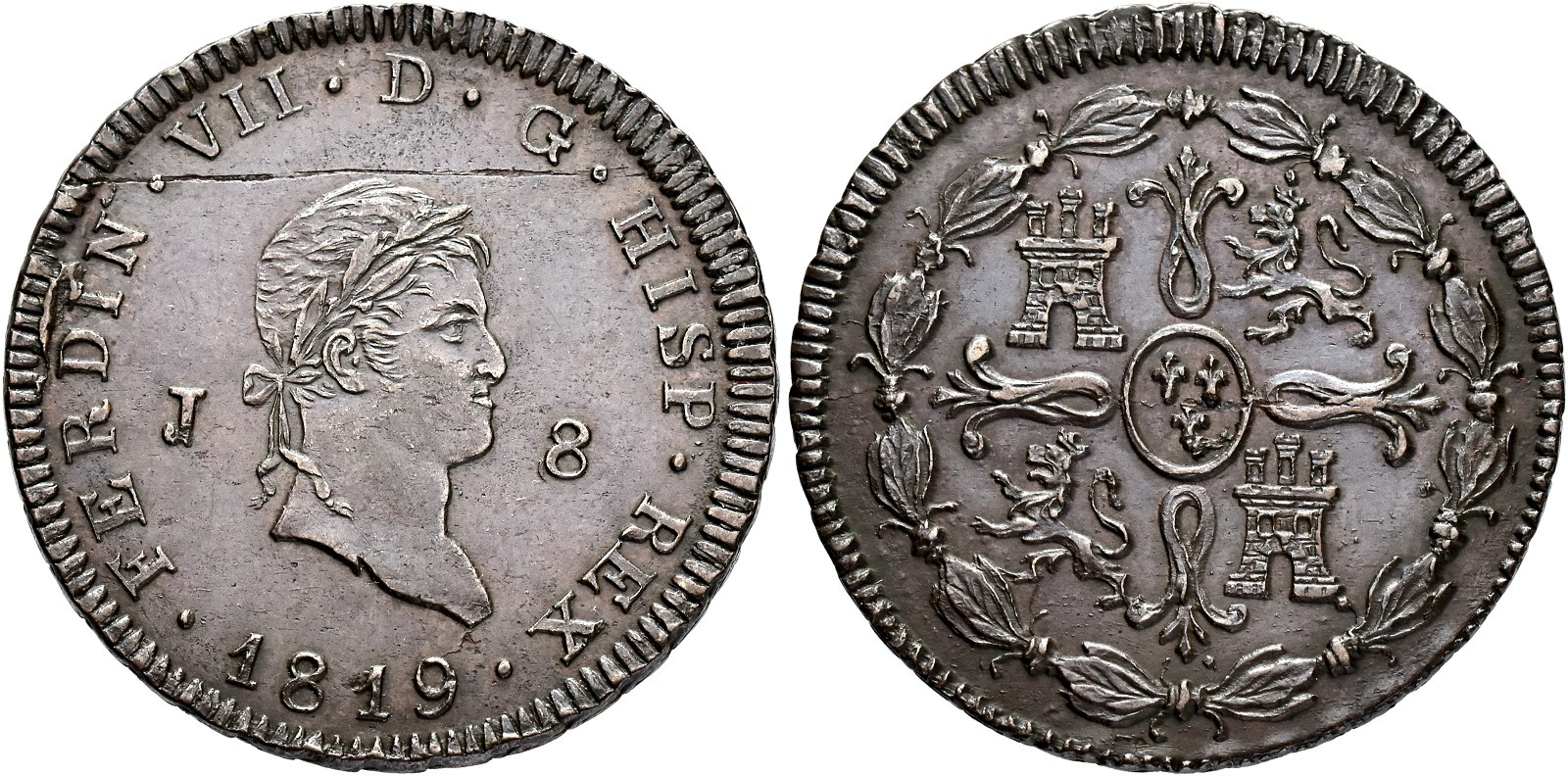 FERNANDO VII. 8 maravedís. 1819. Jubia. CU 9,67 g. 32 mm. VI-208; AC-199; Orol-JU.11A Raya en anv. EBC.