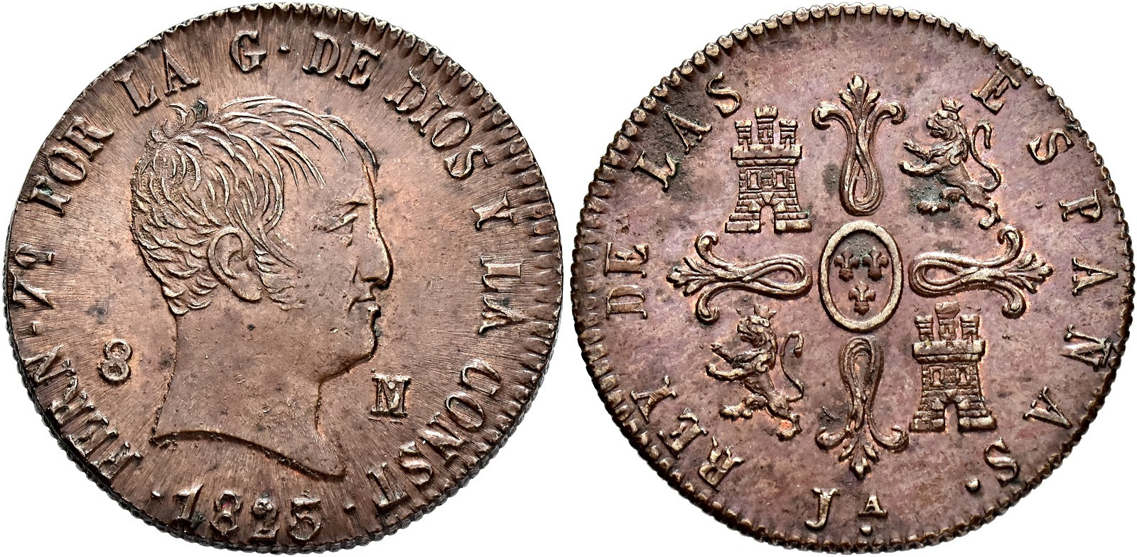FERNANDO VII. 8 maravedís. 1823. Jubia. CU 10,33 g. 28,9 mm. VI-212; AC-204; Orol-JU.16. Pequeñas marcas. EBC.