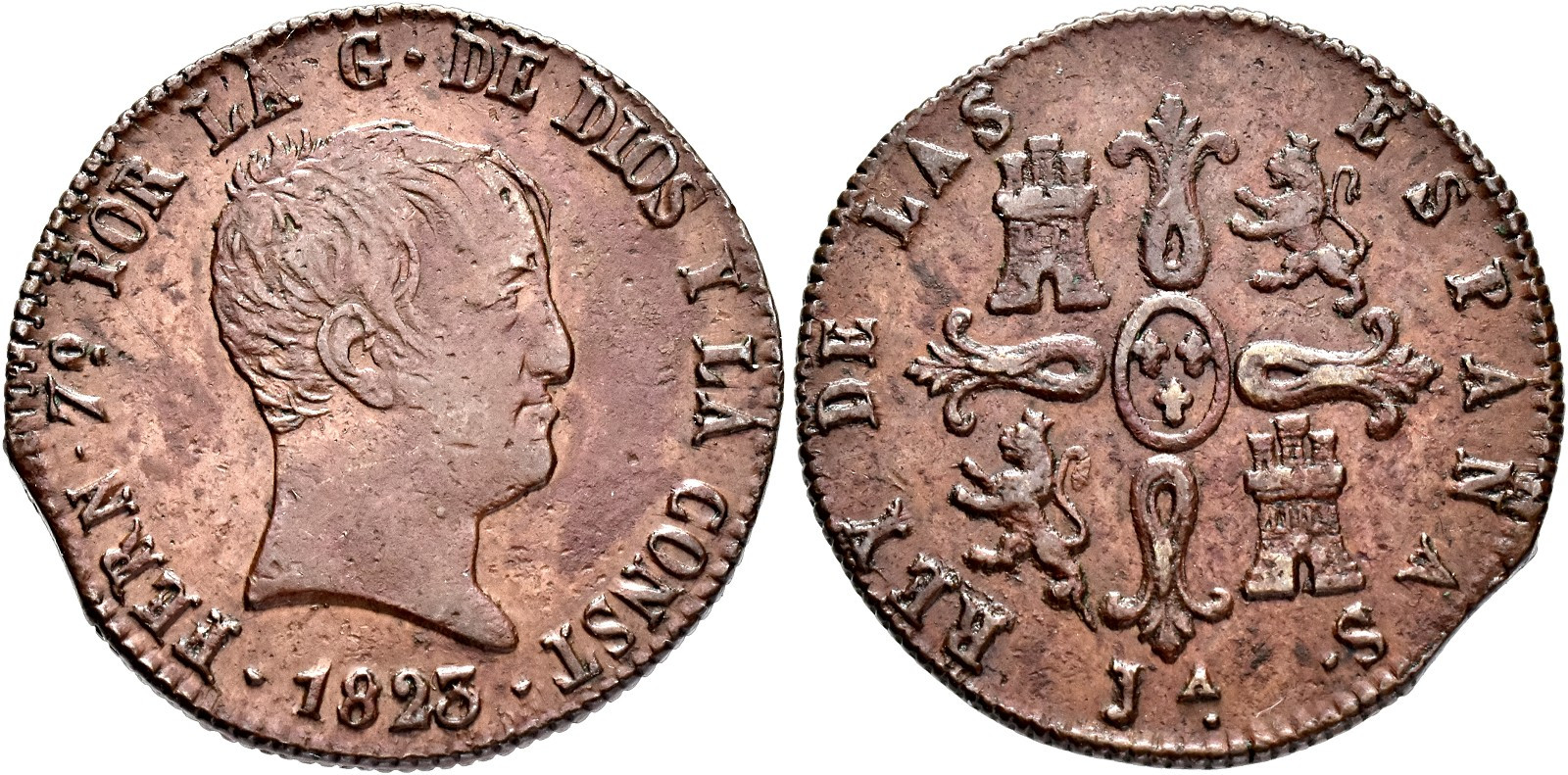 FERNANDO VII. 8 maravedís. 1823. Jubia. Sin valor. CU 10,82 g. 29,3 mm. VI-213; AC-205; Orol-JU.16A Ligero final de plancha. MBC. Rara.