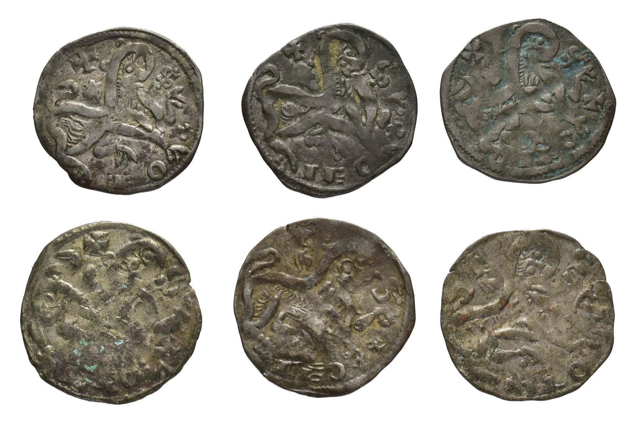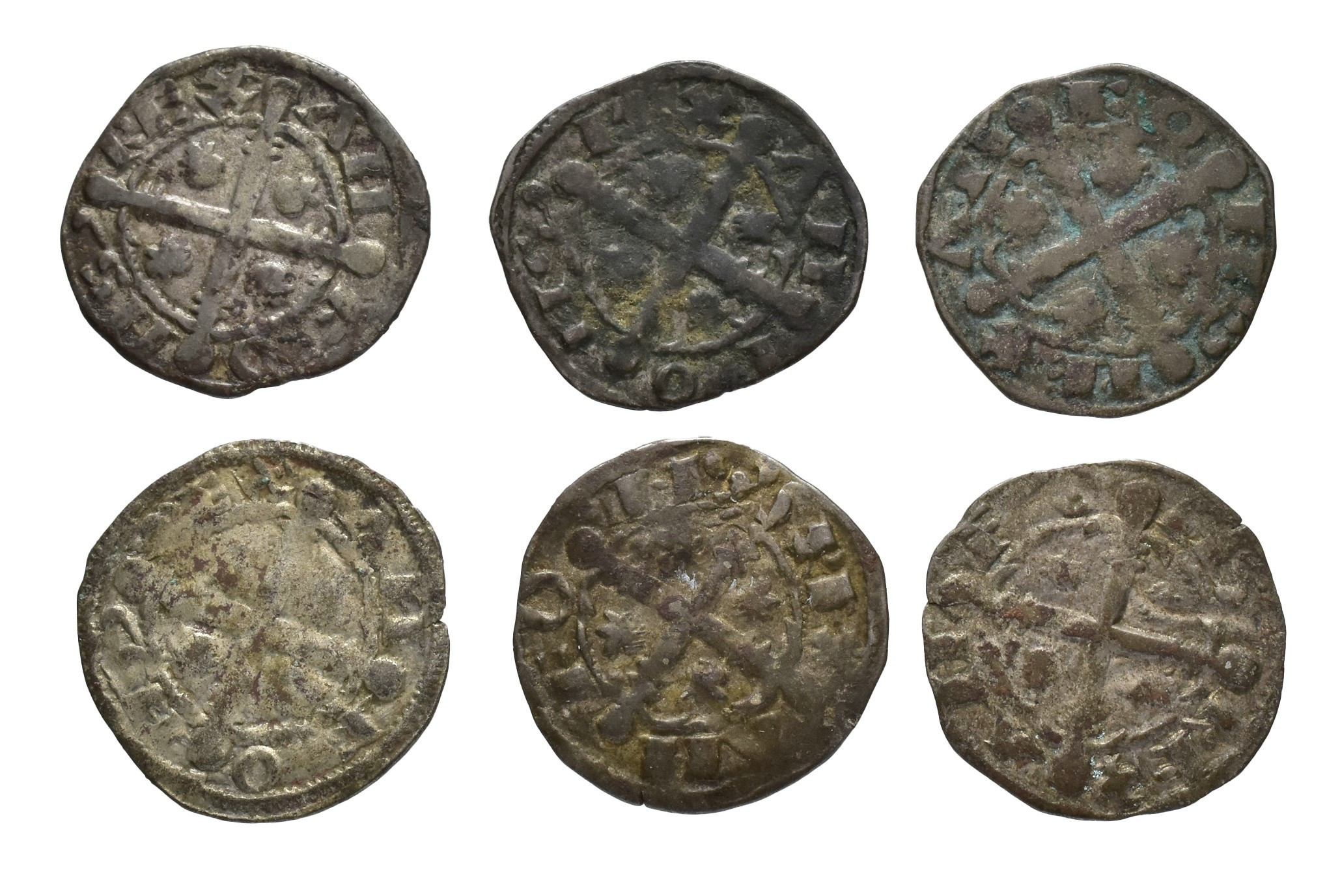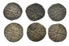 REINOS DE CASTILLA Y LEÓN. ALFONSO IX. Lote de 6 dineros, Santiago, + entre P y L. III-130; BMM-216; Orol-ME.33, 34, 36, 43, 50 y 70. BC+/MBC.