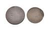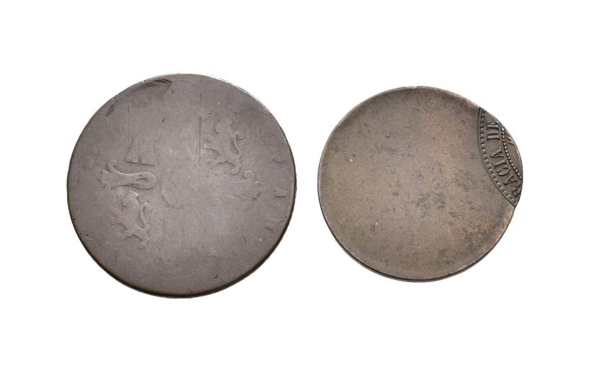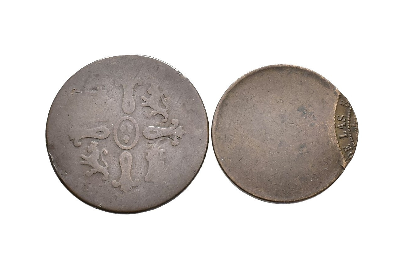 ISABEL II. Lote de 2 piezas: ¿Prueba de cuños? de 8 maravedís con dos reversos y un cospel con una pequeña acuñación de parte de 2 1/2 céntimos de escudo. Orol-JU.111b y 168. BC.