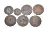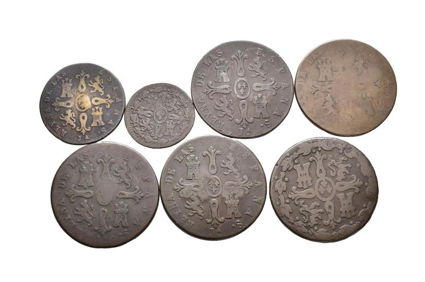 ISABEL II. Lote de 7 piezas con contramarcas con números o letras sobre 2, 4 y 8 maravedís (5). Orol-CO.24, 27, 31, 32, 35, 53 y 54. Las contramarcas MBC.