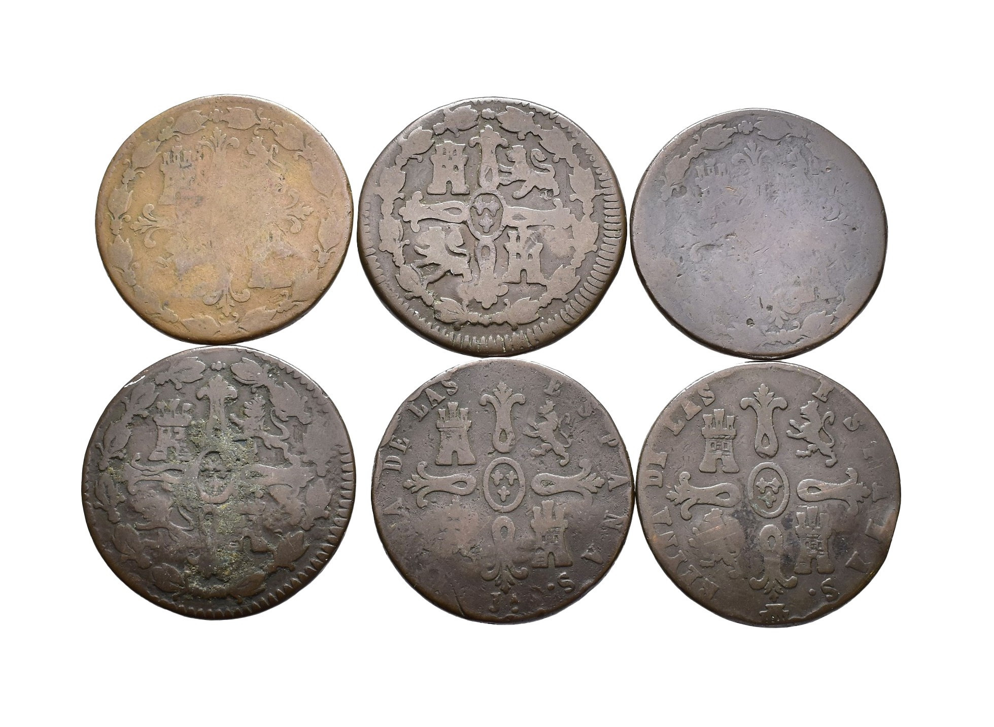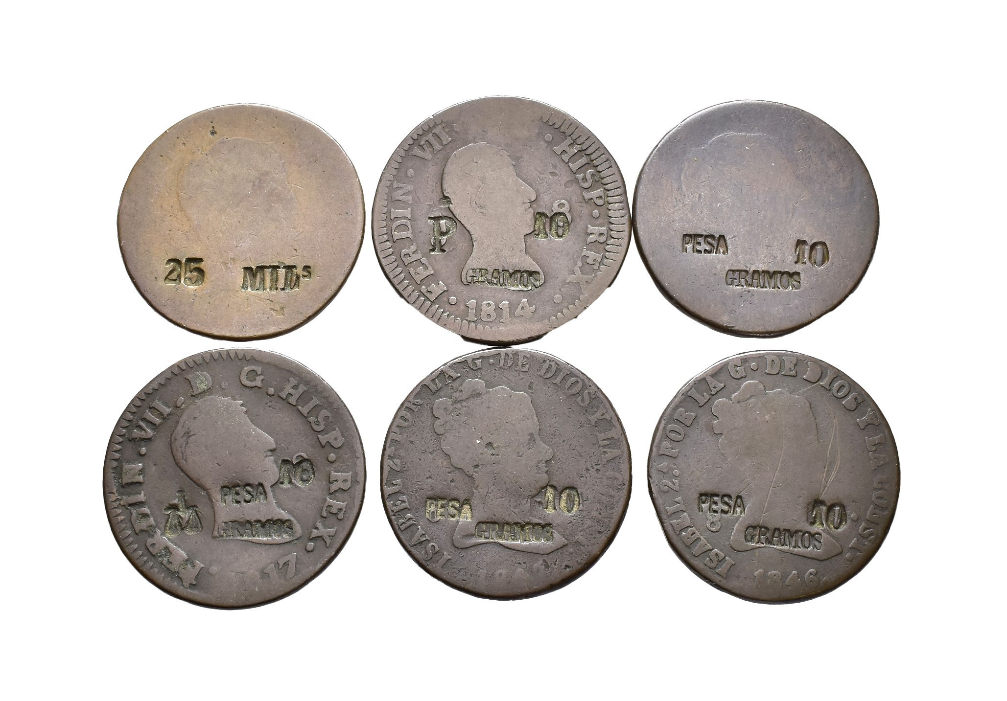 ISABEL II. Contramarcas: "PESA 10 GRAMOS" (3), "P. 10 GRAMOS", balanza y P.10 y "25 MILS". Total 6 piezas. Orol-CO.7, 12, 13, 28, 47 y otra sin foto. Las contramarcas MBC.