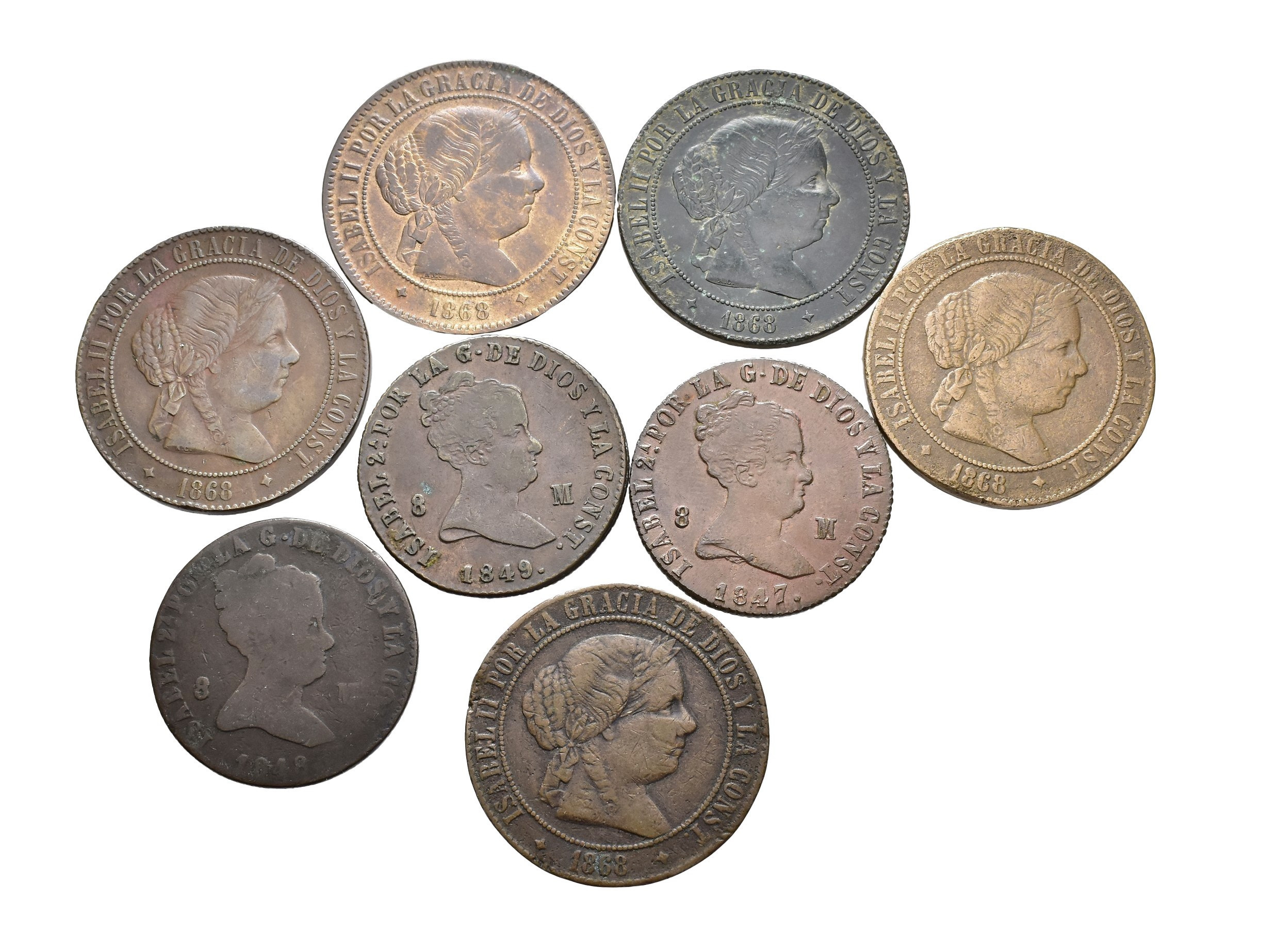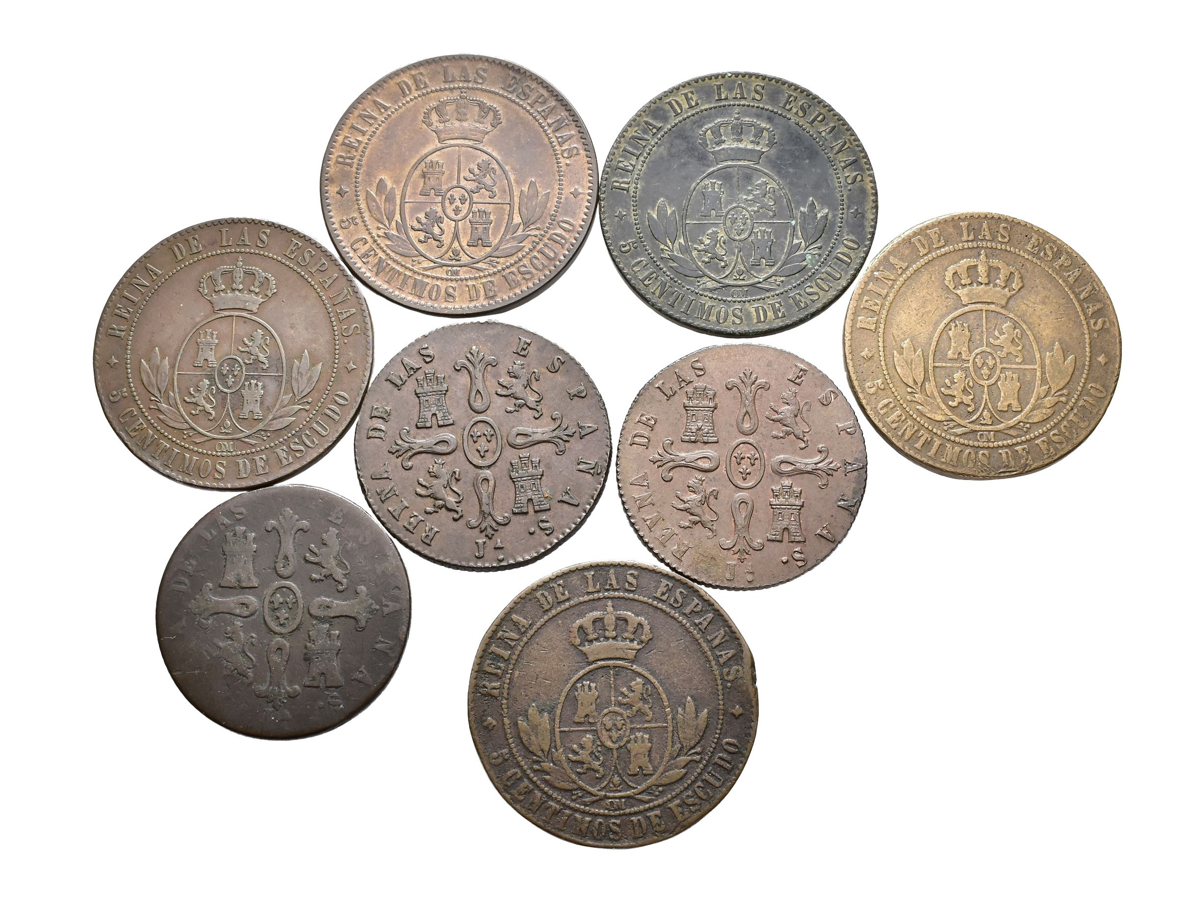 ISABEL II. Lote de 8 piezas: 8 maravedís Jubia 1847, 1848 y 1849 y 5 céntimos de escudo, Jubia, 1868 (5). Orol-JU-63b, 91 b,c, 130, 132, 143a,b y c. BC+/EBC-.