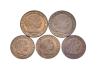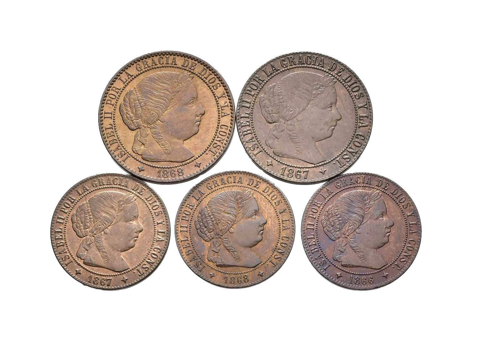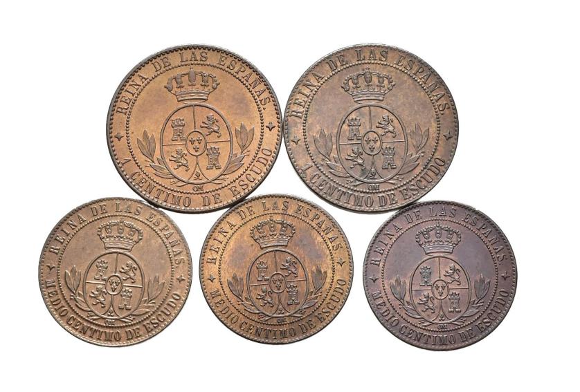 ISABEL II. Lote de 5 piezas: 1 céntimo de escudo 1867 y 1868 Jubia OM, 1/2 céntimo de escudo 1866, 1867 y 1868 Jubia OM. Orol-JU.97, 98, 99a, 100 y 101. R.B.O. EBC/EBC+.