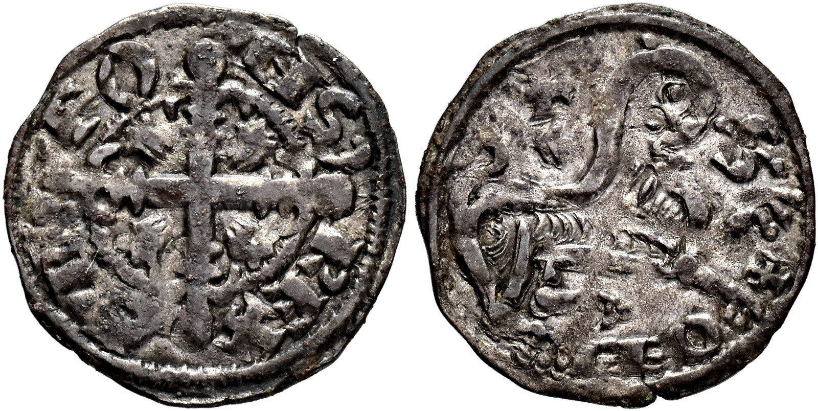 REINOS DE CASTILLA Y LEÓN. ALFONSO IX. Dinero. Santiago. Cruz entre las patas del león. VE 0,77 g. 17,8 mm. III-130; BMM-216; Orol-ME.51. MBC+. Rara en esta conservación.