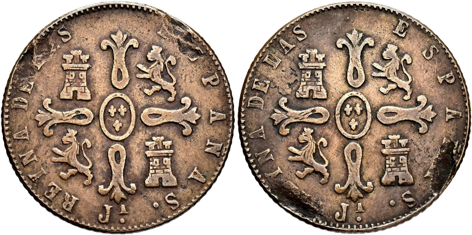 ISABEL II. Prueba de cuños de 8 maravedís Jubia con 2 reversos. Orol-JU.111a. Hojas. MBC. Rara.