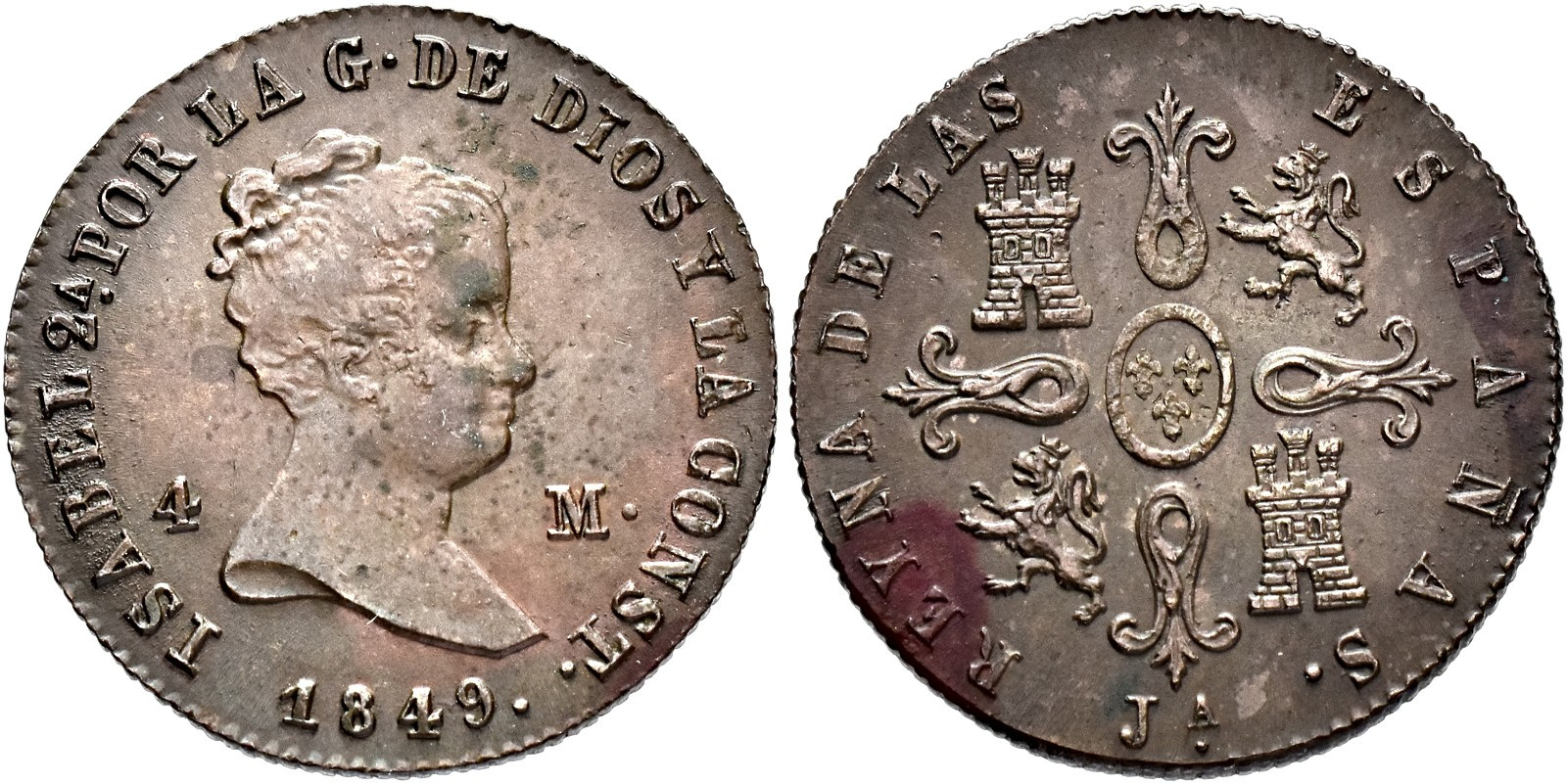 ISABEL II. 4 maravedís. 1849. Jubia. CU 5,11 g. 23,5 mm. VI-42; AC-75; Orol-JU.74 Manchitas. MBC+. Escasa.