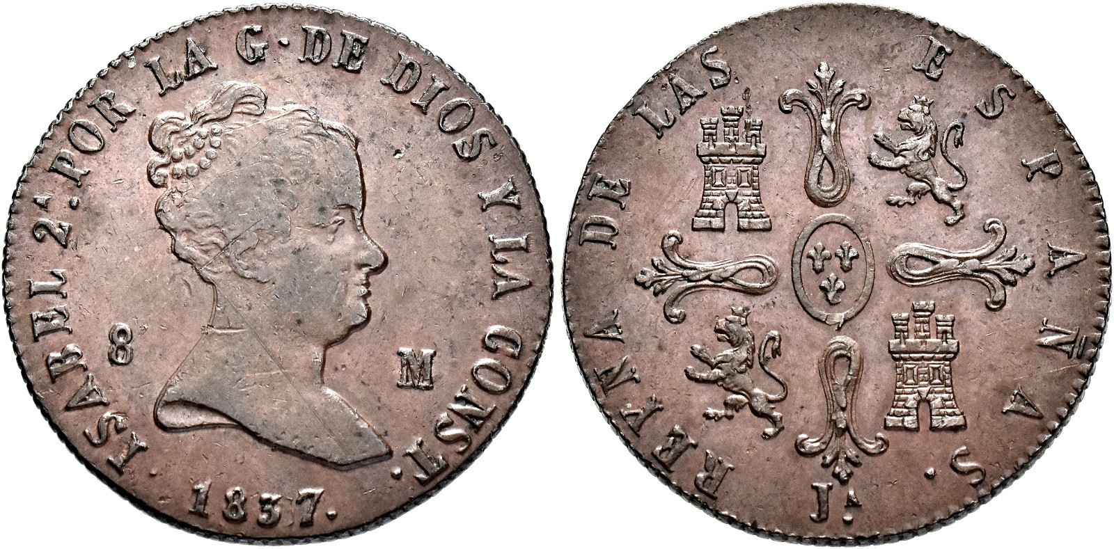 ISABEL II. 4 maravedís. 1849. Jubia. CU 4,58 g. 24 mm. VI-42; AC-75. Doble acuñación en anv. MBC+/EBC-.
