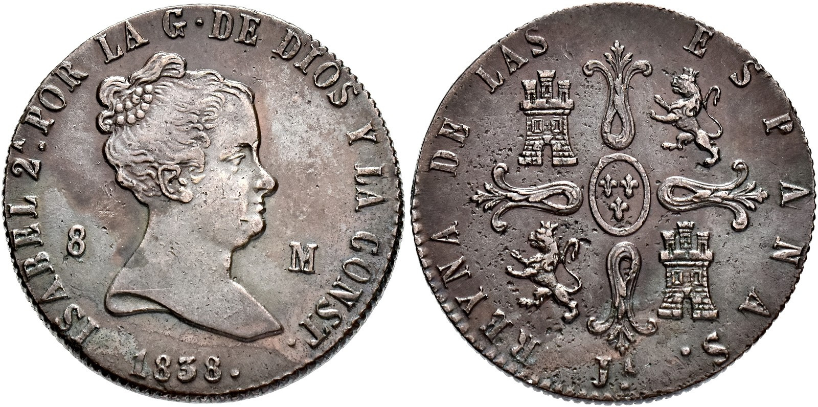 ISABEL II. 8 maravedís. 1838/7. Jubia. CU 10,7 g. 27,9 mm. VI-69; AC-105; Orol-JU.54 Pequeñas marcas en rev. EBC-.