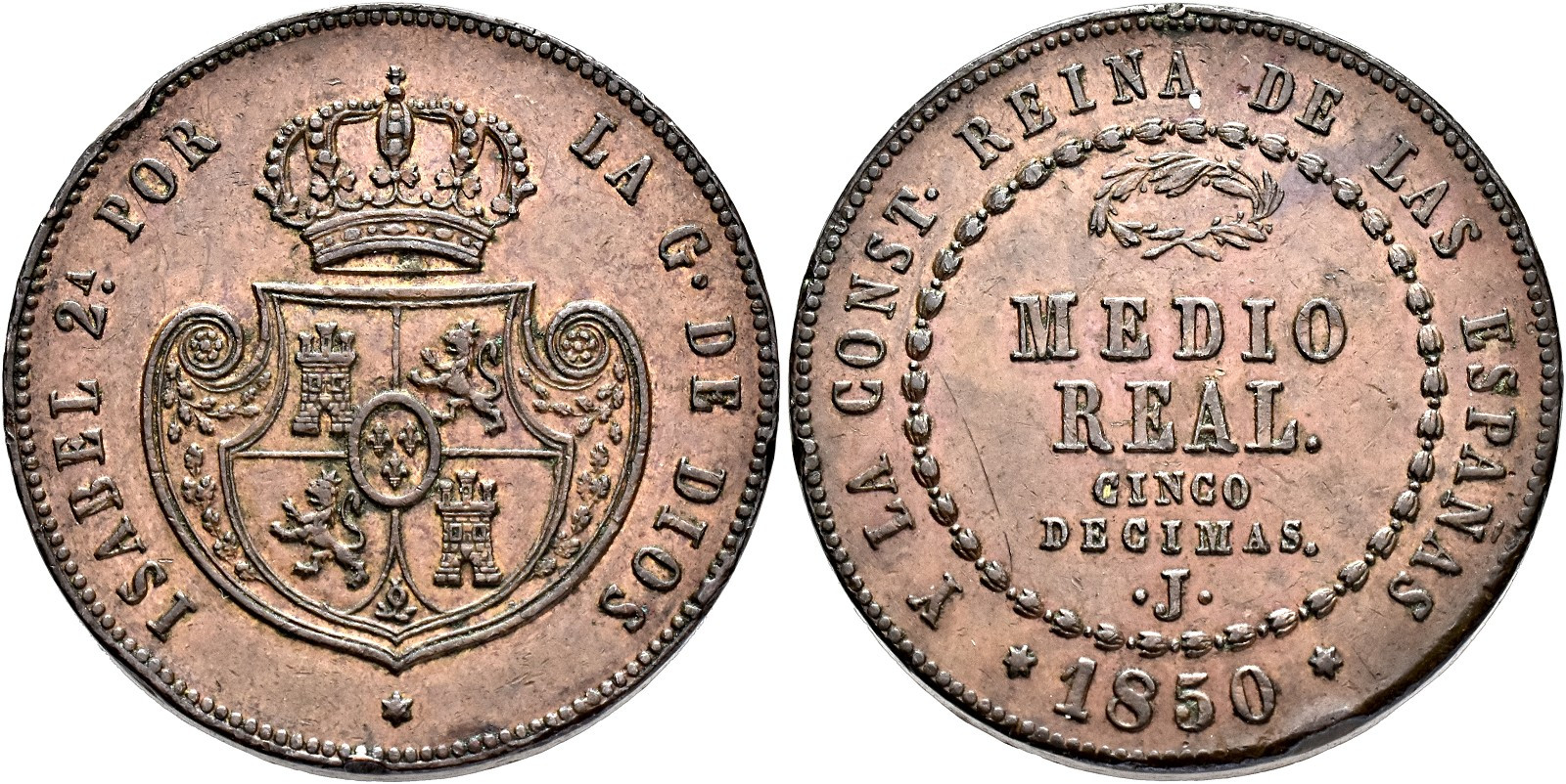 ISABEL II. 1/2 real. 1850. Jubia. CU 19,72 g. 31,7 mm. VI-112; AC-149; Orol-JU.88 Golpe y golpecitos en gráfilas. MBC+. Escasa.