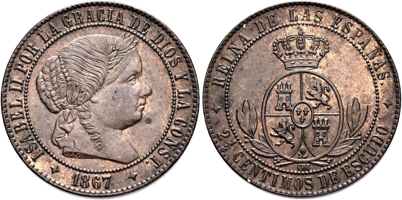 ISABEL II. 2 1/2 céntimos de escudo. 1867. Jubia. CU 6,26 g. 25 mm. VI-189; AC-236; Orol-JU.93 EBC.