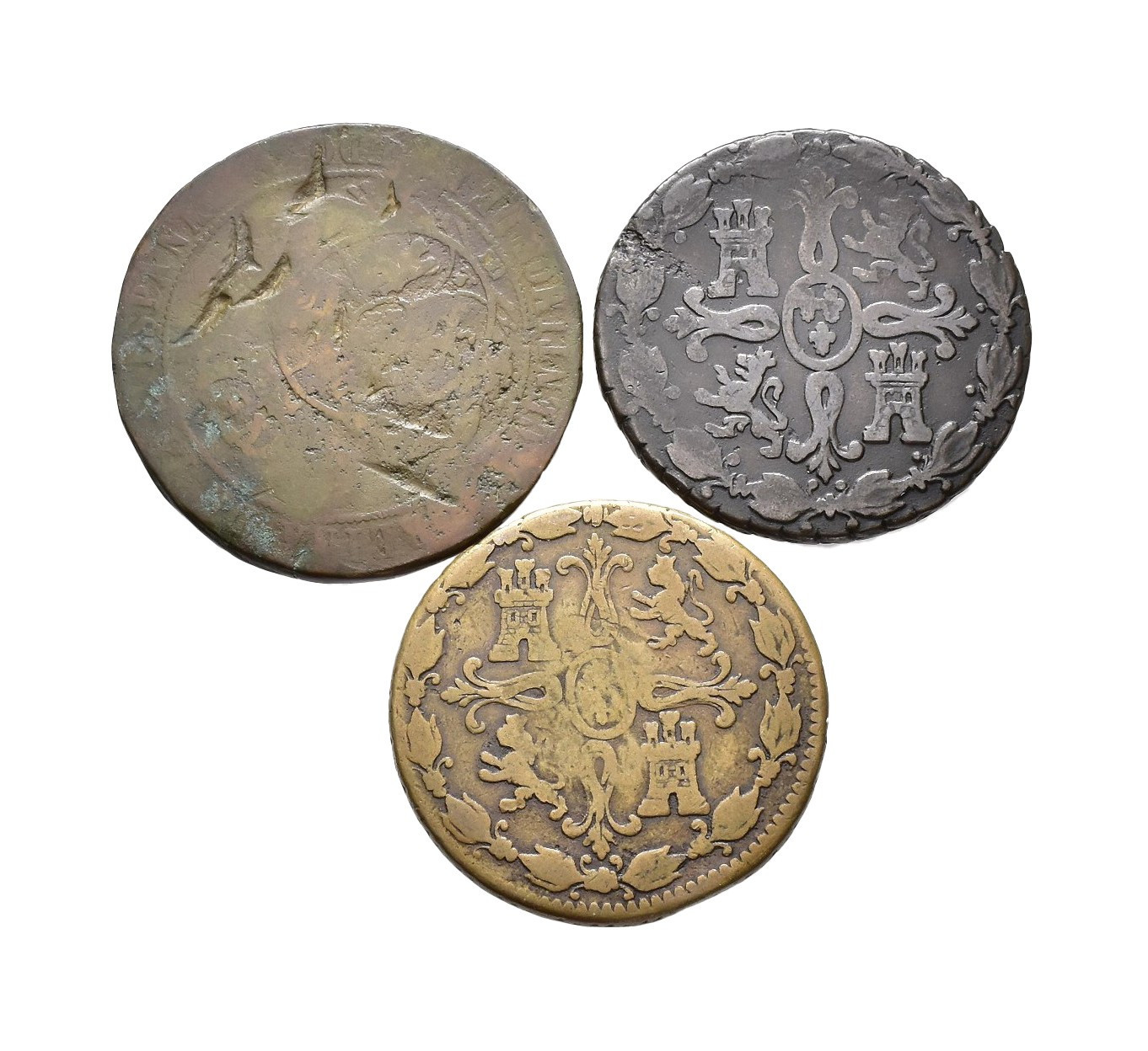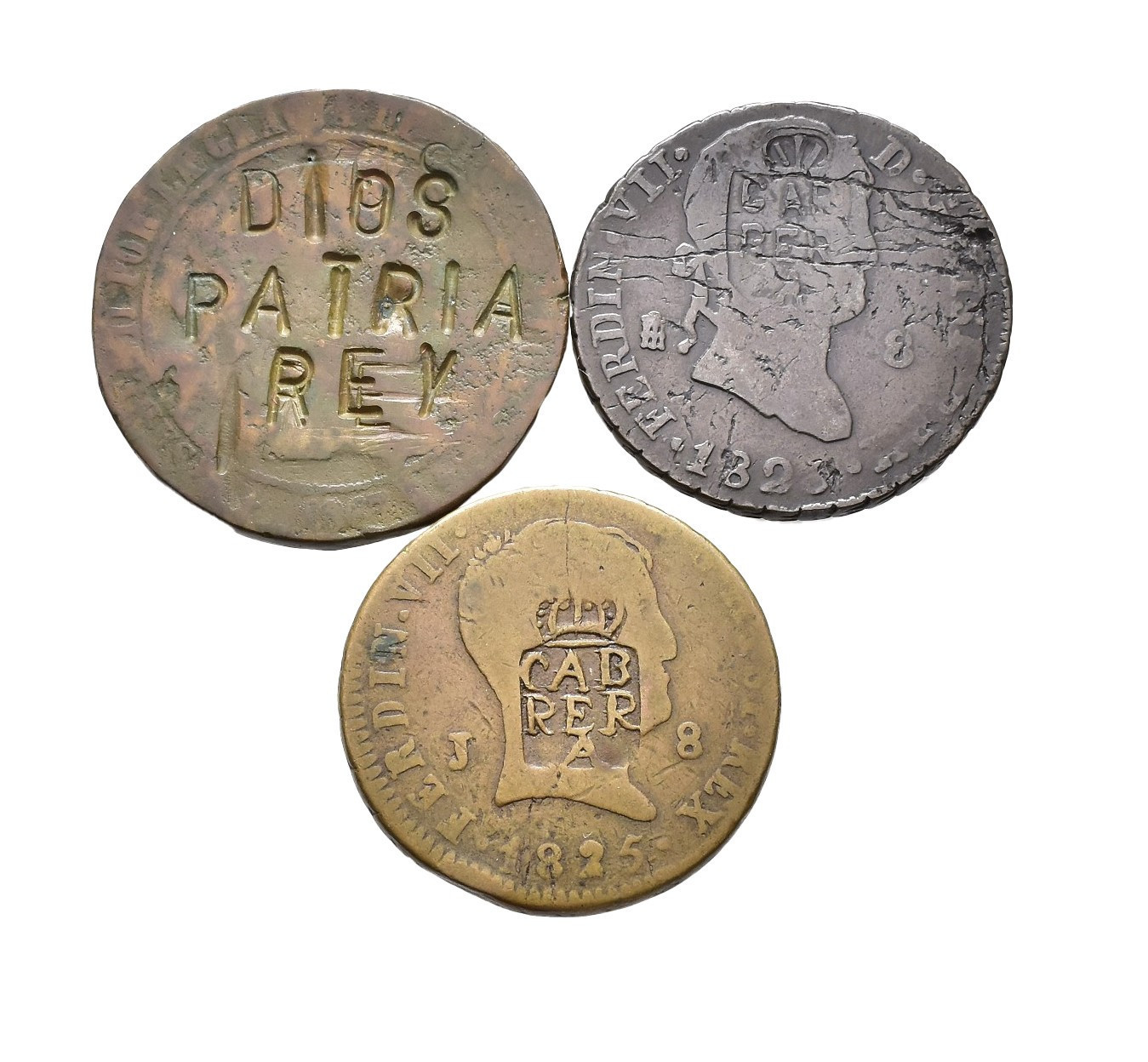 GUERRAS CARLISTAS. Lote de 3 piezas. Contramarcas carlistas sobre 8 maravedís de Fernando VII, DIOS, PATRIA REY y 2 CABRERA. Total 3 piezas. Orol-CO.4, 36 y 38. Las contramarcas una BC+ y las otras MBC.