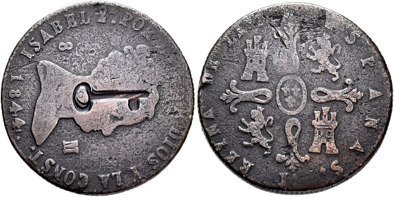 Sobre 8 maravedís 1844, Jubia, contramarca llave. Orol-CO.33. La contramarca MBC. Rara.