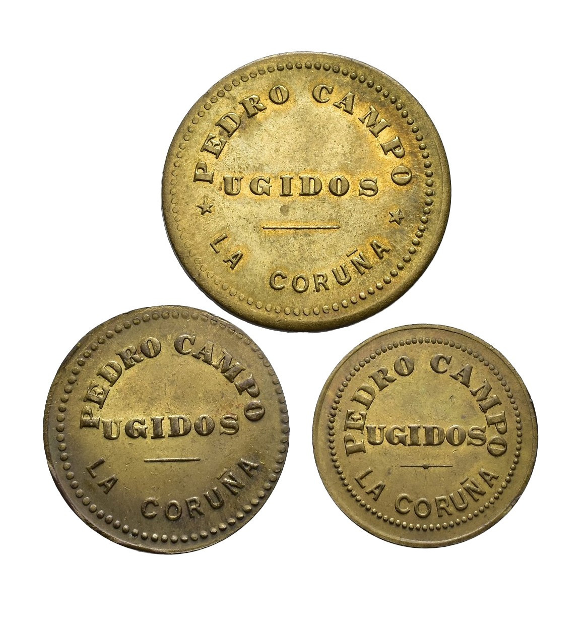 FICHAS COMERCIALES. Serie de 3 fichas de UN DÍA, 1/2 DÍA y UNA HORA PEDRO CAMPO UGIDOS (ARMADOR) CORUÑA en latón. Orol-FL.10, 11 y 12. EBC-/EBC. Muy interesante.