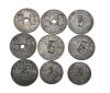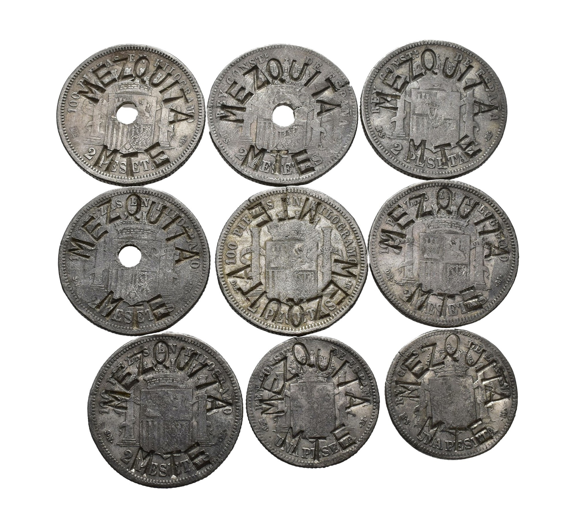 FICHAS COMERCIALES. Lote de 9 fichas con valor 50 (5), 5 (4) y 1 (2) punzonadas sobre 1 y 2 pts. de 1869 a 1883, falsas de época en calamina todas marcadas con FALSA. Orol-FL.17 y 18. Los resellos MBC.