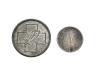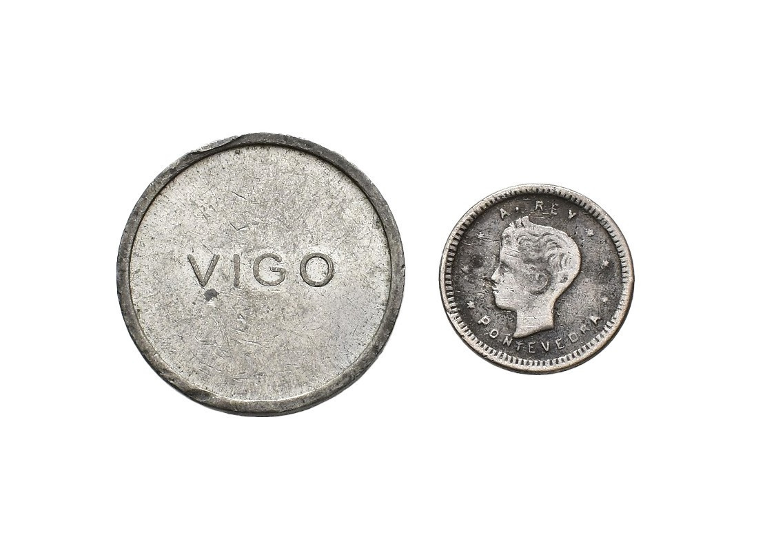 FICHAS COMERCIALES. Lote de 2 fichas de propaganda A. REY PONTEVEDRA imitando los 50 cts. de Alfonso XIII, incierta Vigo en calamina. Orol-FL.24 y 25. MBC.