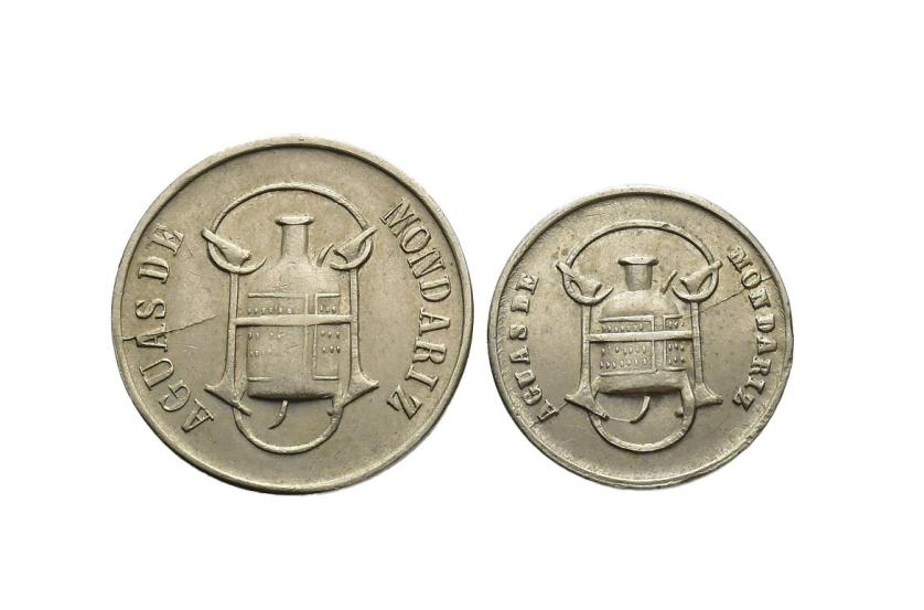 FICHAS COMERCIALES. Lote de 2 fichas AGUAS DE MONDARIZ. Peseta y 50 cts. En metal blanco. Orol-FL.33 y 34. MBC+/EBC-. Rara.