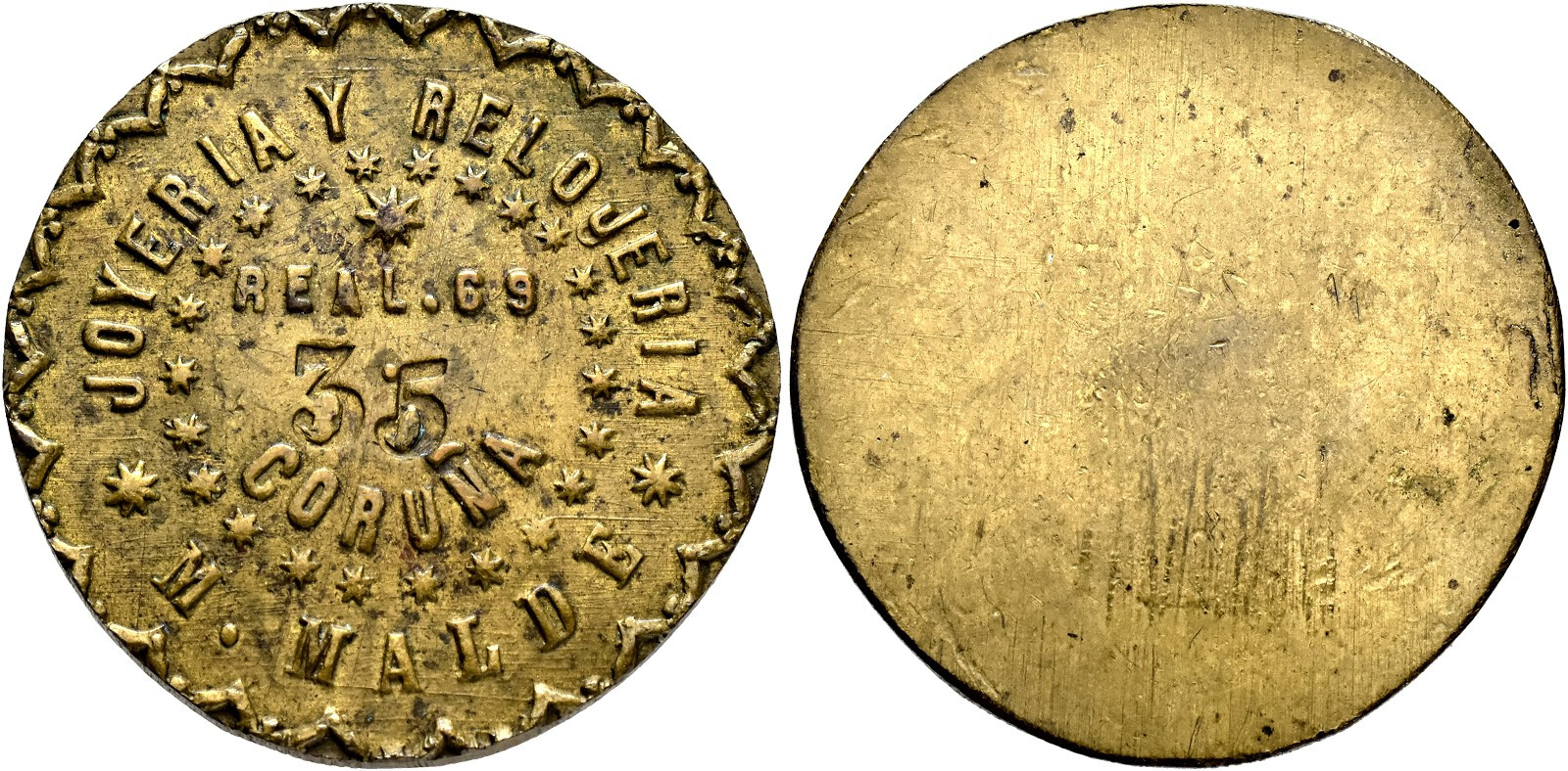 FICHAS COMERCIALES. Ficha comercio JOYERÍA Y RELOJERÍA M. MALDE / CORUÑA con punzón 35. Bronce/latón 14,75 g. 32,6 mm. Orol-FL.2. MBC+.