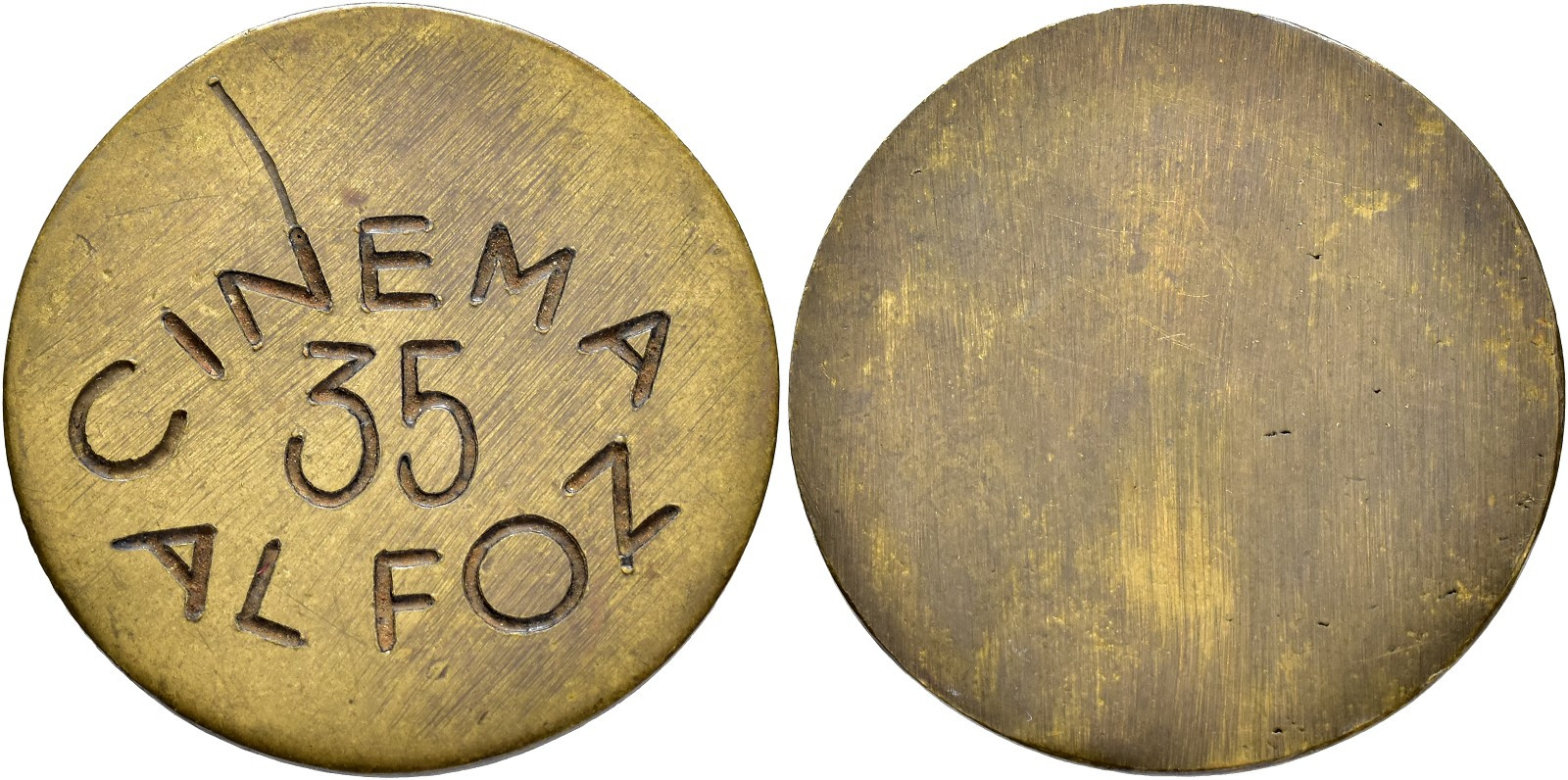 FICHA COMERCIAL. CINEMA ALFOZ 35 en bronce. 5,44 g. 30 mm. Orol-FL.19. Raya. MBC. Rara.