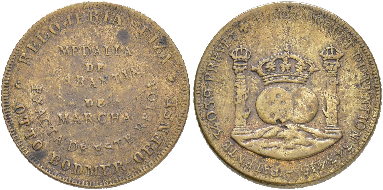 FICHA COMERCIAL. MEDALLA DE GARANTÍA RELOJERÍA SUIZA OTTO BODNER ORENSE en latón. 3,5 g. 20,9 mm. Orol-FL.21. Rayas. MBC-/B+. Rara.
