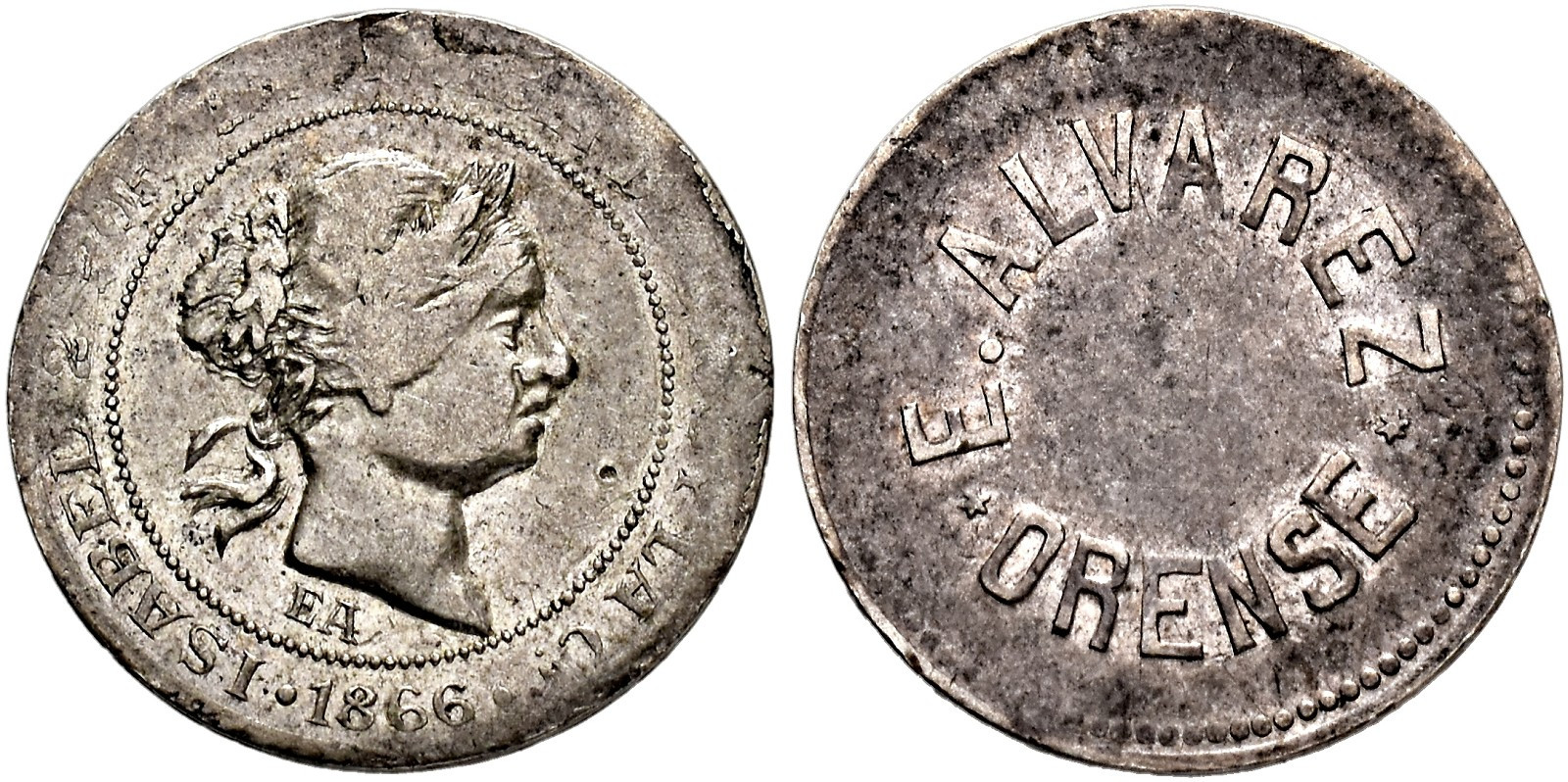 FICHA COMERCIAL. Ficha publicitaria. E. ALVAREZ ORENSE imitando el real de Isabel II con fecha 1866. AR 1,18 g. 14,7 mm. Orol-FL.22. MBC. Rara.