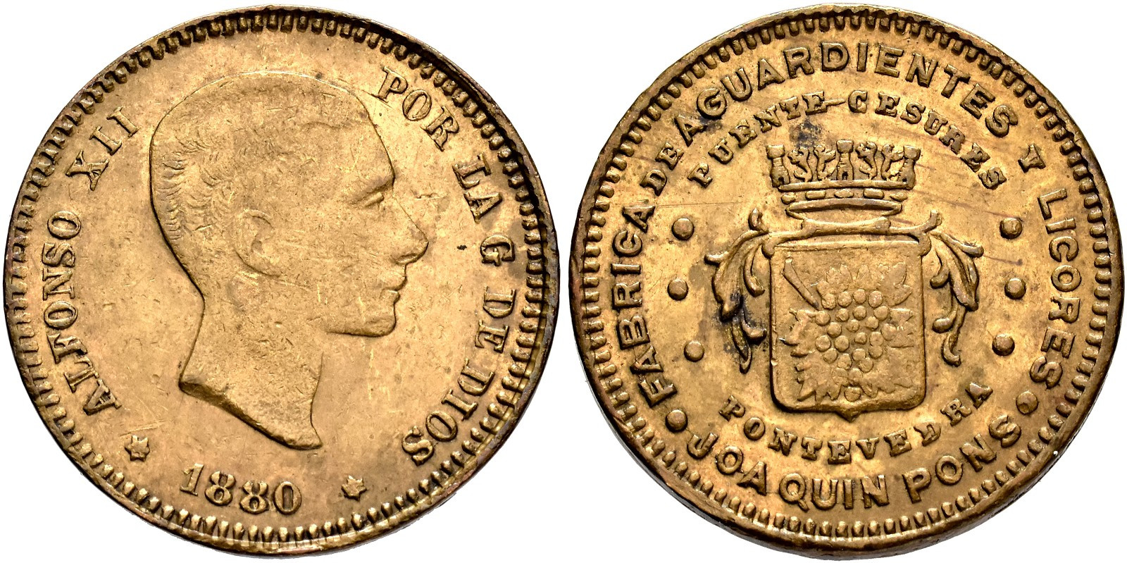 FICHA COMERCIAL. Ficha de propaganda. JOAQUIN PONS AGUARDIENTES Y LICORES PUENTECESURES PONTEVEDRA. Latón 5,27 g. 25,1 mm. Orol-FL.23. MBC+. Rara.