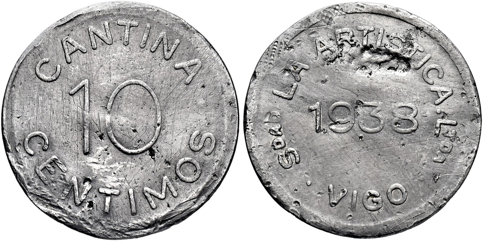 FICHA COMERCIAL. SOCIEDAD LA ARTÍSTICA (VDA. DE TOMAS ALONSO) 10 CTMOS 1938 VIGO. Aluminio 0,67 g. 22,1 mm. Orol-FL.32. Golpes y rayas. MBC-. Rara.