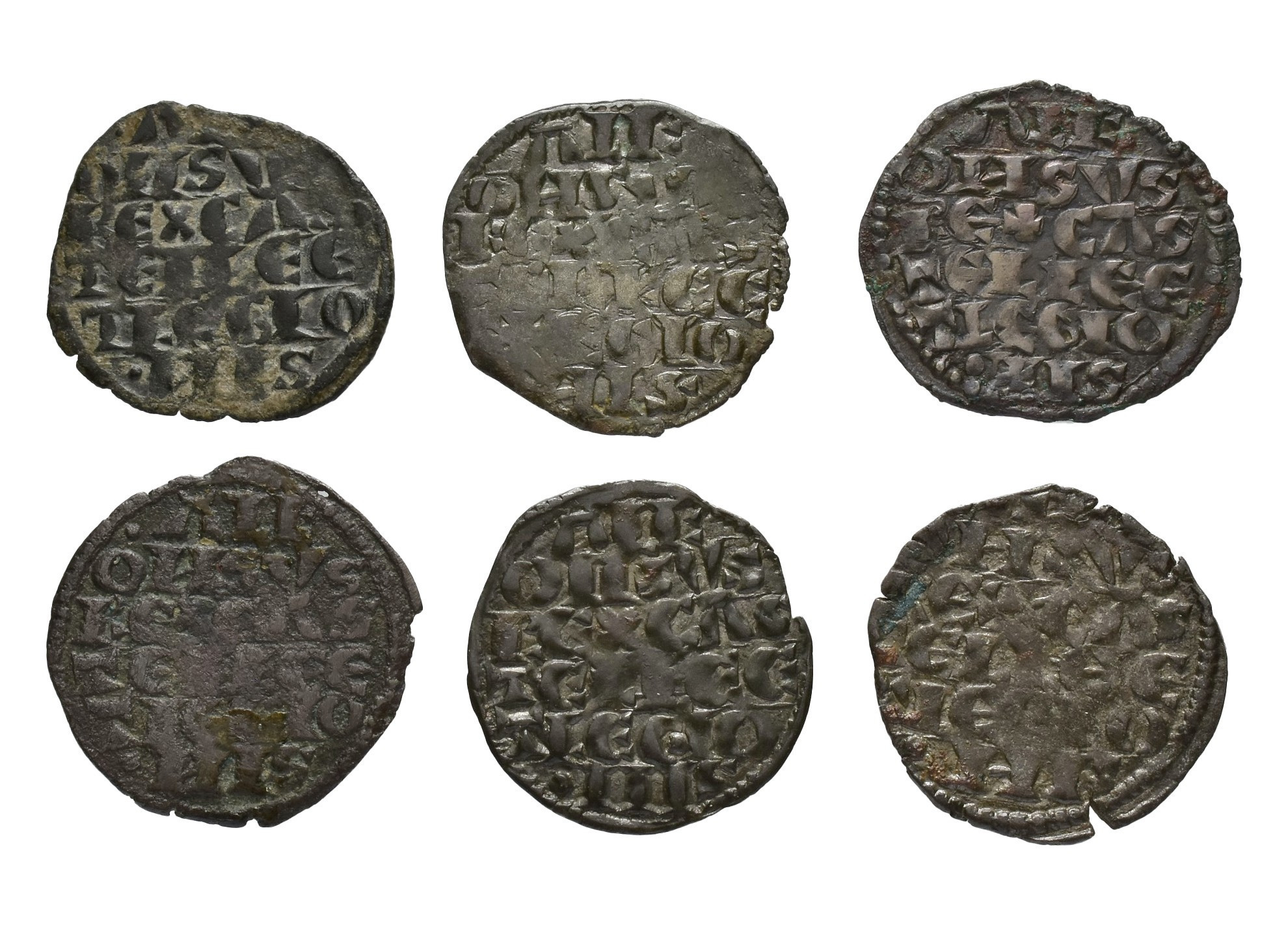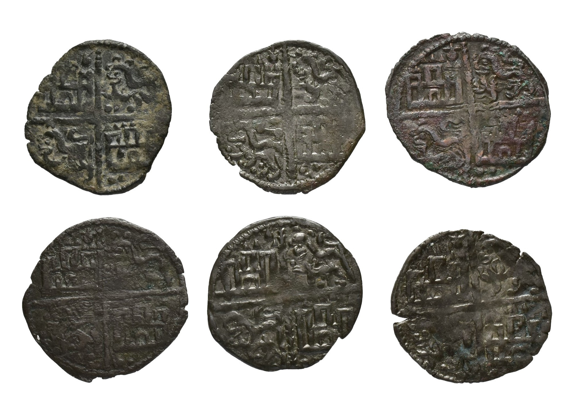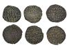 REINOS DE CASTILLA Y LEÓN. ALFONSO X. Lote de 6 dineros, Coruña, marca venera y dos puntos en tercer cuartel. Orol-ME.105, 106, 107, 112, 113 y 114. MBC-/MBC+.