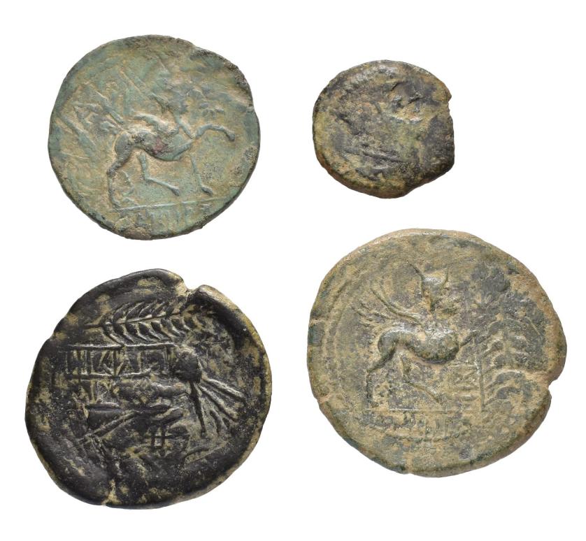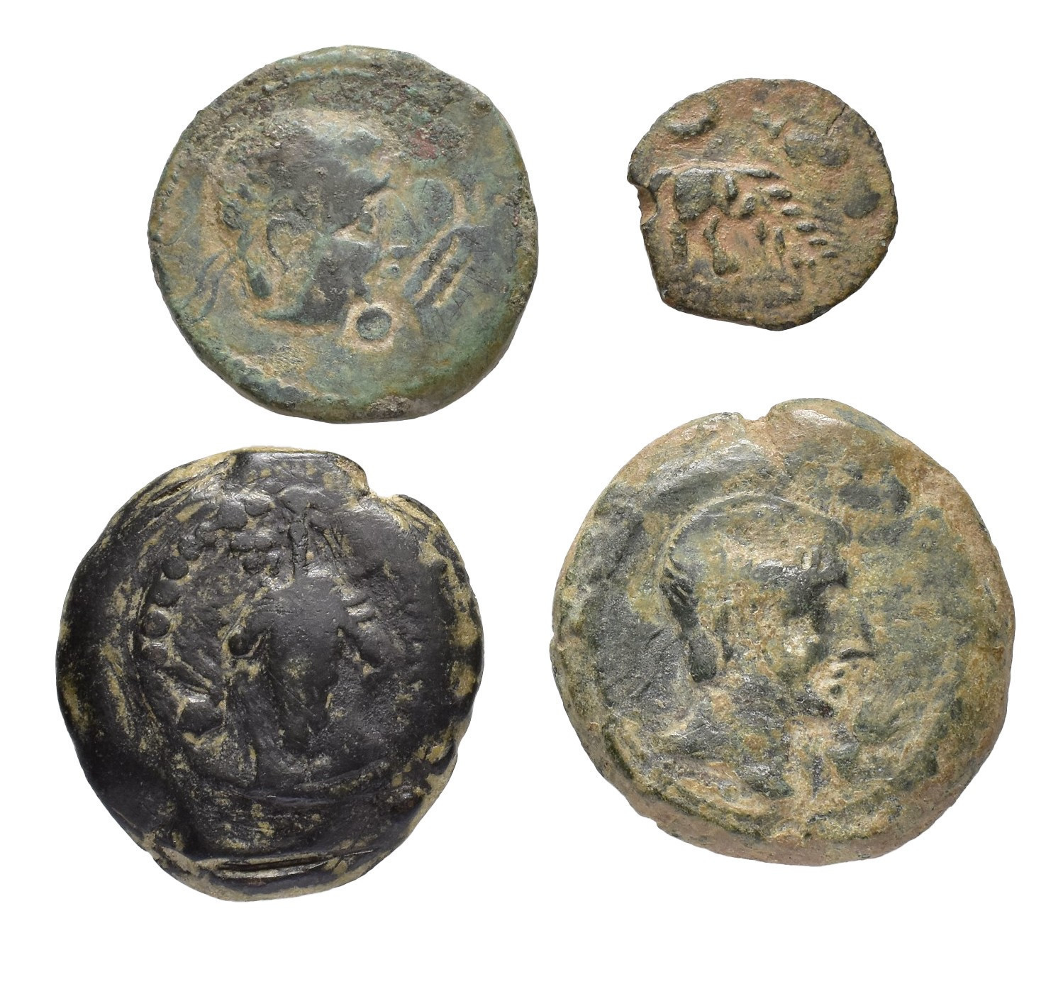 HISPANIA ANTIGUA. Lote de 4 monedas ibéricas acuñadas sobre otras: 2 Castulo sobre Obulco, 1 Ilipa sobre Castulo y 1 Acinipo sobre Obulco. BC/MBC-