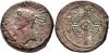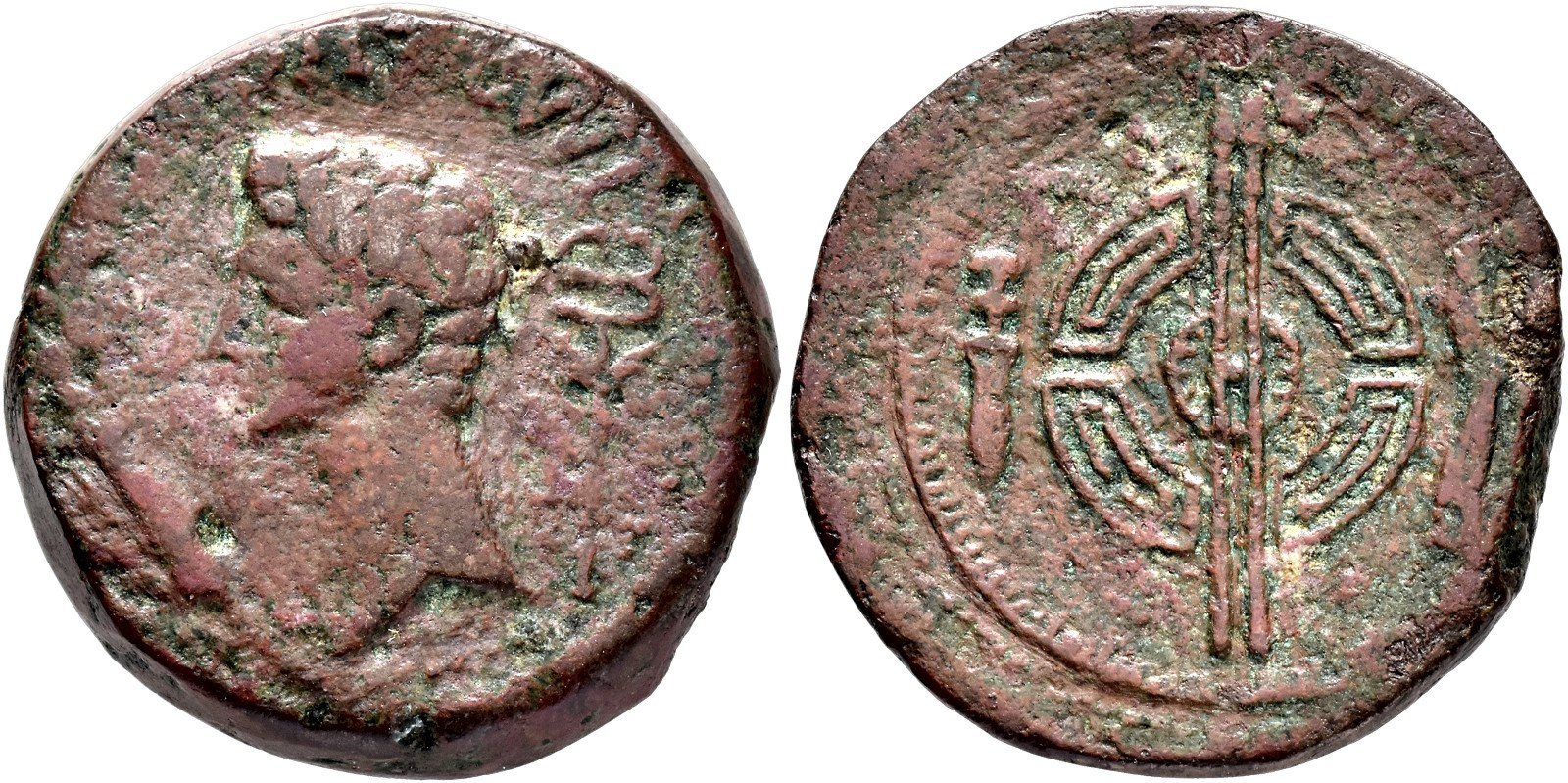 HISPANIA ANTIGUA. EMISIONES DEL NOROESTE. AUGUSTO. Dupondio. A/ Cabeza a izq., delante palma, detrás caduceo; IMP (AVG DIVI F). R/ Rodela con dos lanzas entre cuchillo y falcata hacia arriba. AE 20,27 g. 29,9 mm. I-1702; APRH-2; ACIP-3300; Orol-AN.4. Pátina rojiza. BC/MBC-. Muy escasa.
