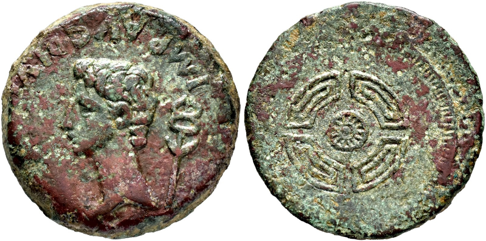 HISPANIA ANTIGUA. EMISIONES DEL NOROESTE. AUGUSTO. As. A/ Cabeza a izq., delante palma, detrás caduceo; IMP AVG DIV(I F). R/ Rodela. AE 8,84 g. 24,5 mm. I-1706; APRH-3; ACIP-3301; Orol-AN.17, mismo ejemplar. Pátina verde con tonos rojos. MBC/MBC-.